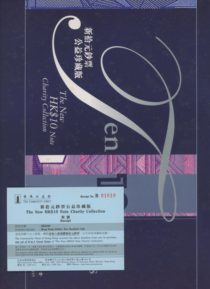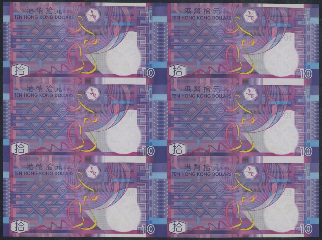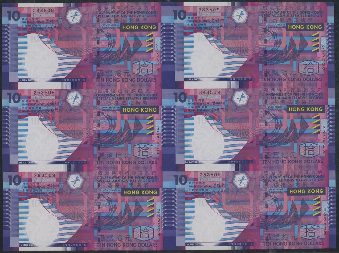 Government of Hong Kong, a uncut sheets of 6x $10, commemorative issue by The Community Chest, 1.7.2002, serial numbers 243509, 253509, 263509, 333509, 343509 and 353509, (Pick 400a), uncirculated, in original cardboard tube of issue with the certificate of authenticity, certificate #01610.