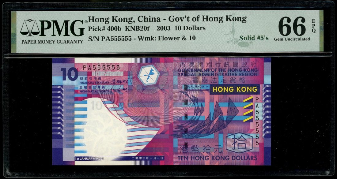 Hong Kong Government, $10, 1.1.2003, solid serial number PA555555, (Pick 400b), PMG 66EPQ.