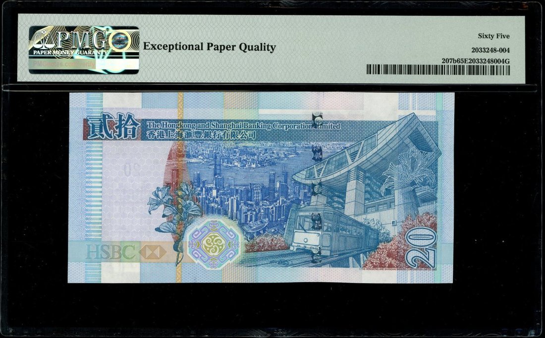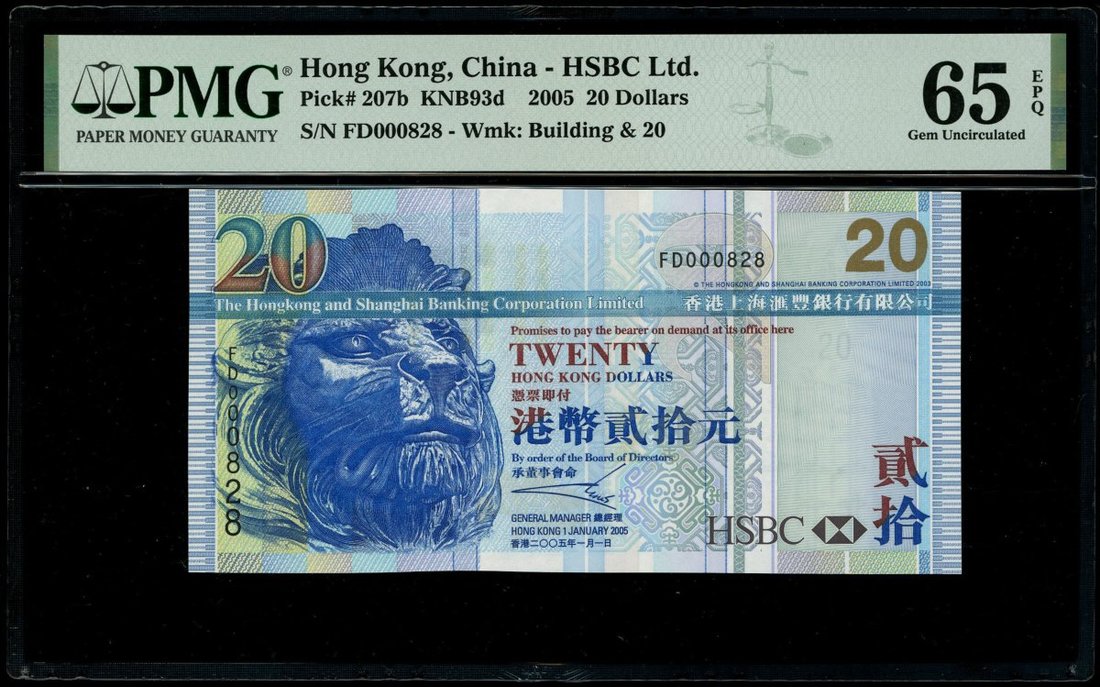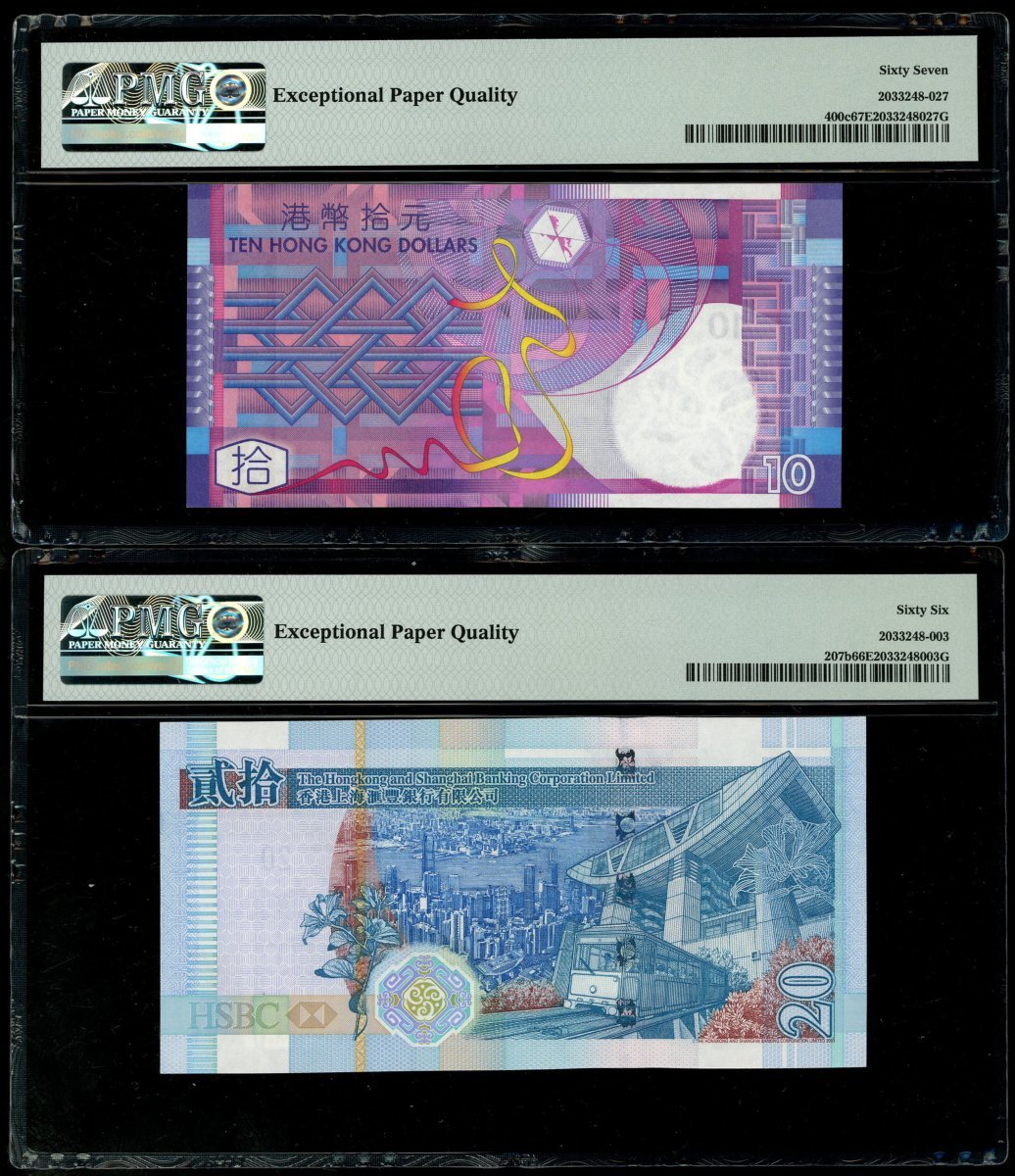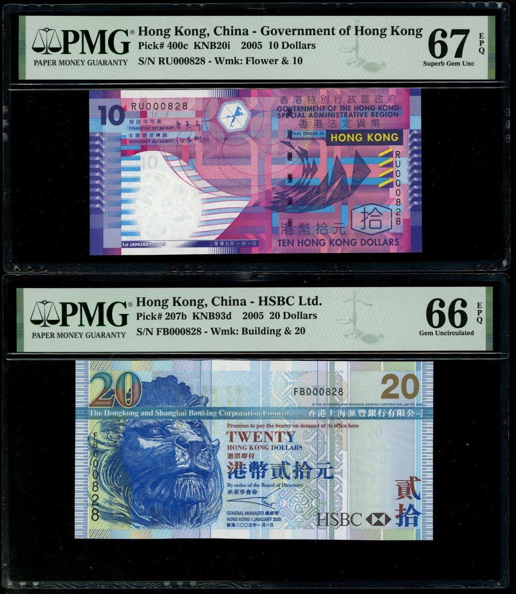 香港紙鈔一組3枚,包括2005年香港政府10元,及2005年香港上海匯豐銀行20元2枚,不同字軌相同編號RU000828,FB000828及FD000828,分別評 PMG 67EPQ,66EPQ及65EPQ