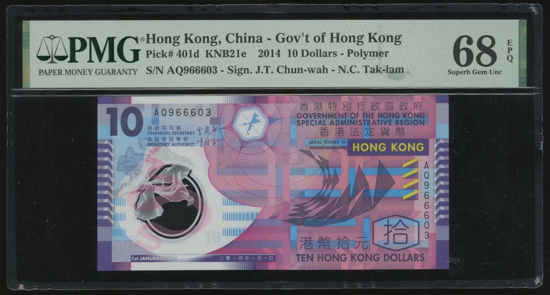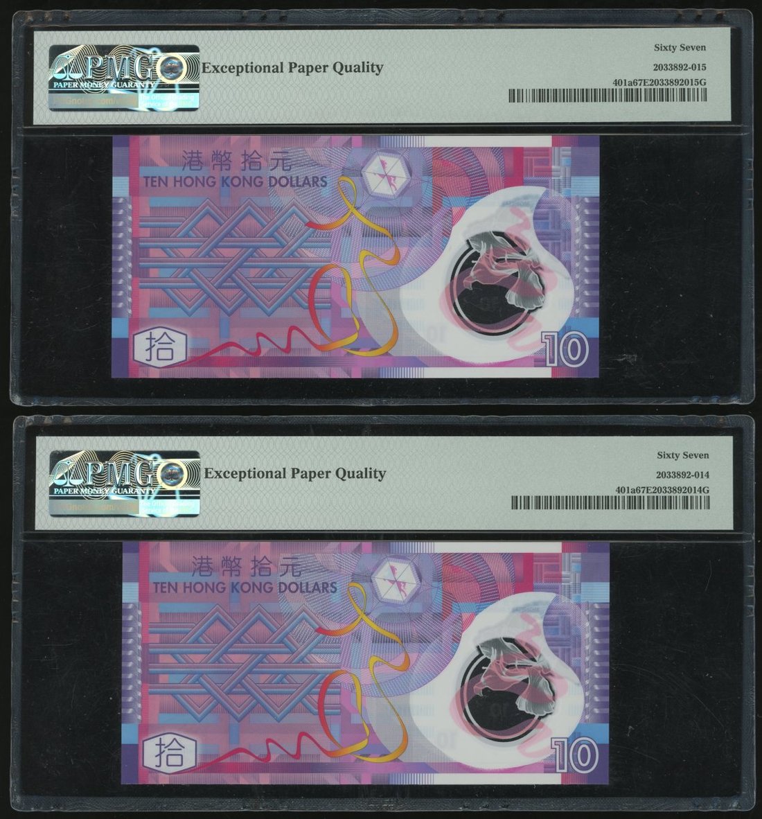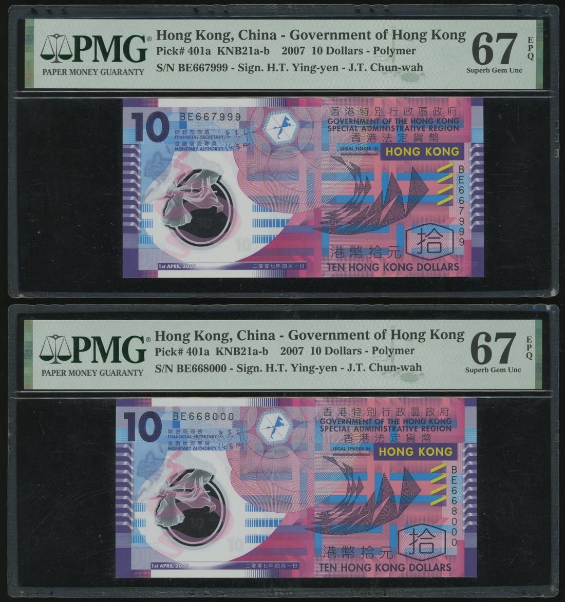Government of Hongkong, 3x $10, 1.4.2007 (2) and 1.1.2014, serial numbers BE667999-8000 and AQ966603, (Pick 401a, 401d), the first two graded PMG 67EPQ, the third 68EPQ (3)