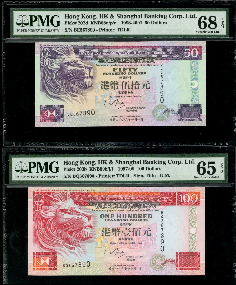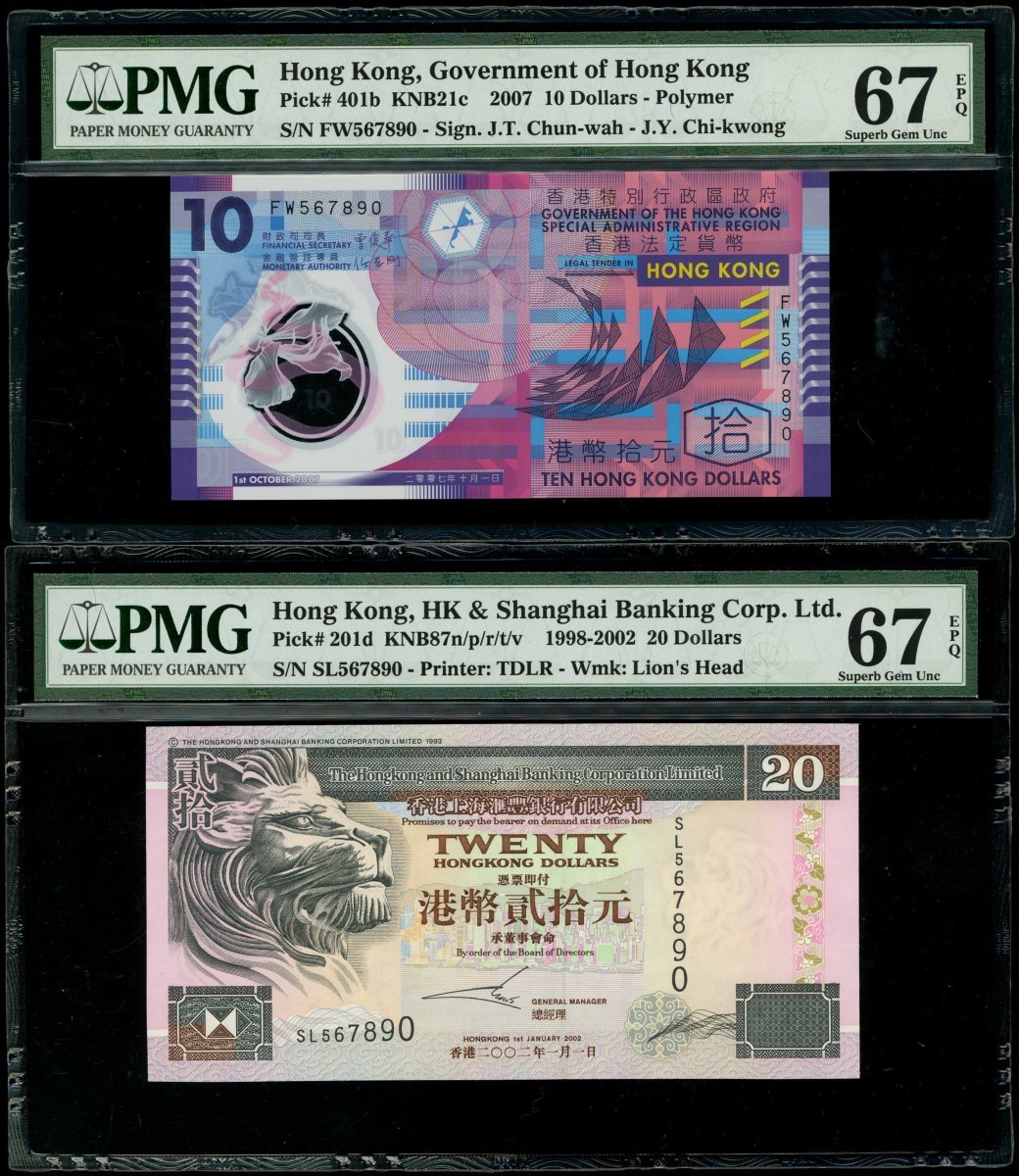 香港紙鈔一組4枚,2007年香港政府10元、匯豐銀行2002年20元、2000年50元及1997年100元,相同順蛇號567890,首2枚PMG 67EPQ、其餘68EPQ及65EPQ