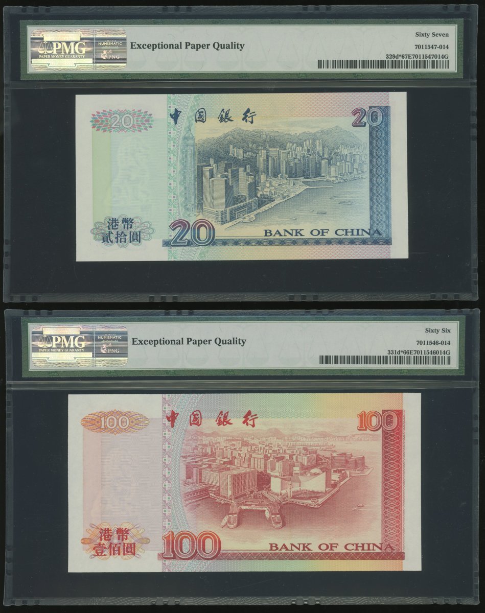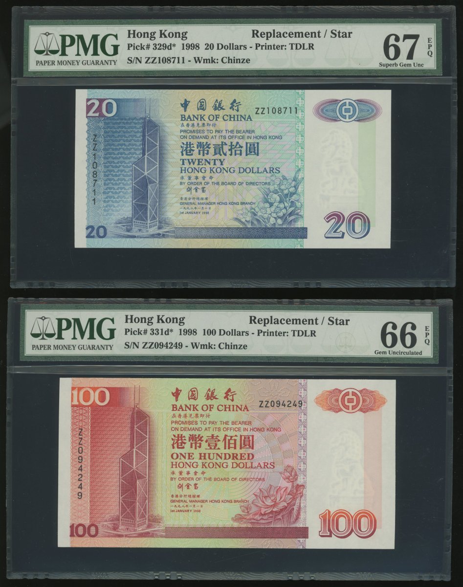 Bank of China, $20 and $100, 1.1.1998, replacement numbers ZZ108711 and ZZ094249, (Pick 329d* and 331d*), graded PMG 67EPQ and 66EPQ respectively (2)
