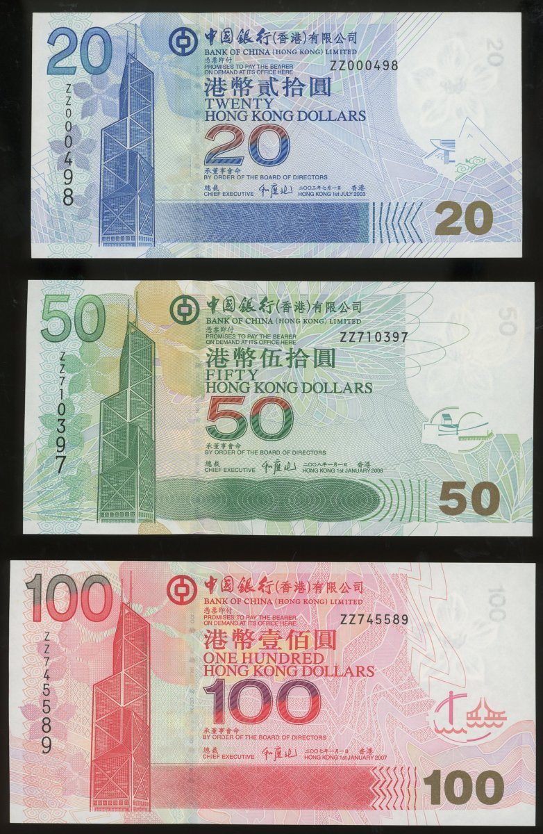 Bank of China, a group of 6x replacement notes, from the series of 2003 consisting of $20, $50, $100 (2), $500 and $1000, (Pick 335a*, 336e*, 337d*, 338d, and 339c*), uncirculated with a couple with minor toning (6).