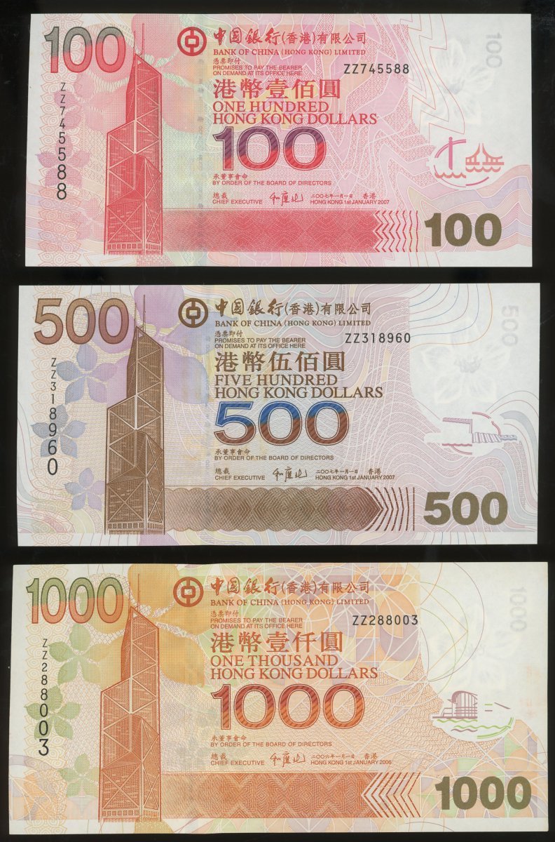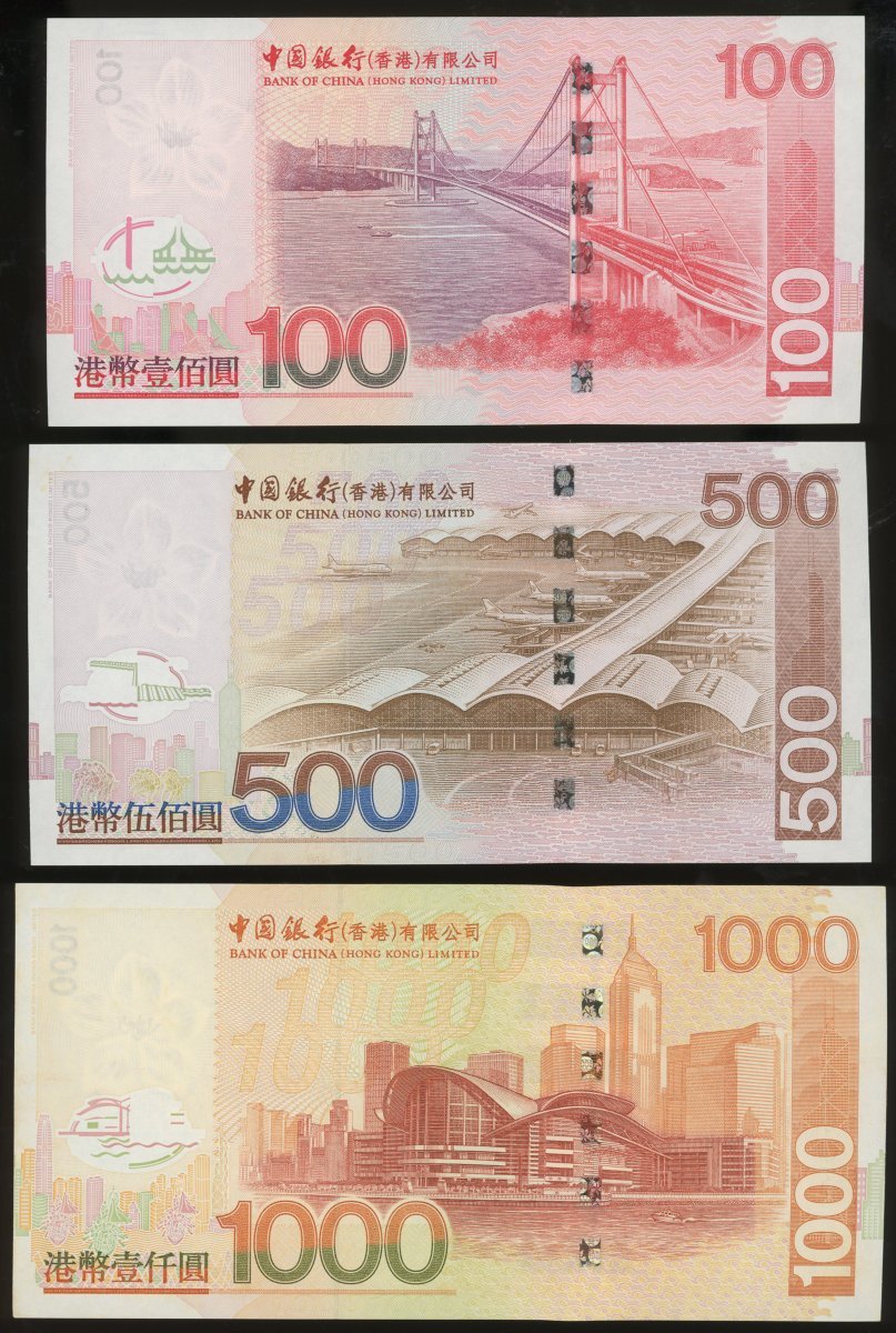 2003年中國銀行補版一組6枚,包括20元, 50元, 100元 (2), 500元 及 1000元,UNC,若干有微黃