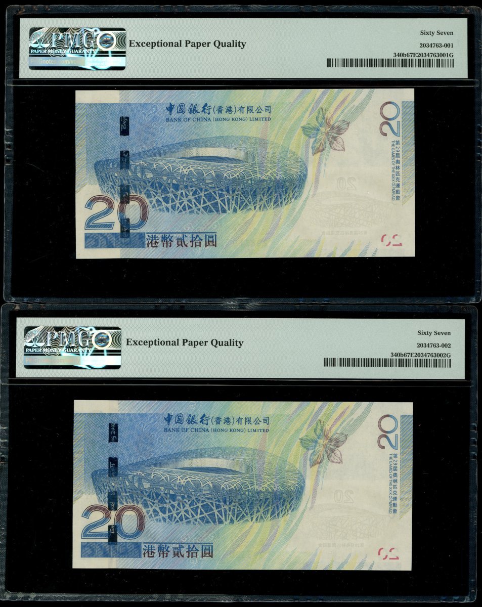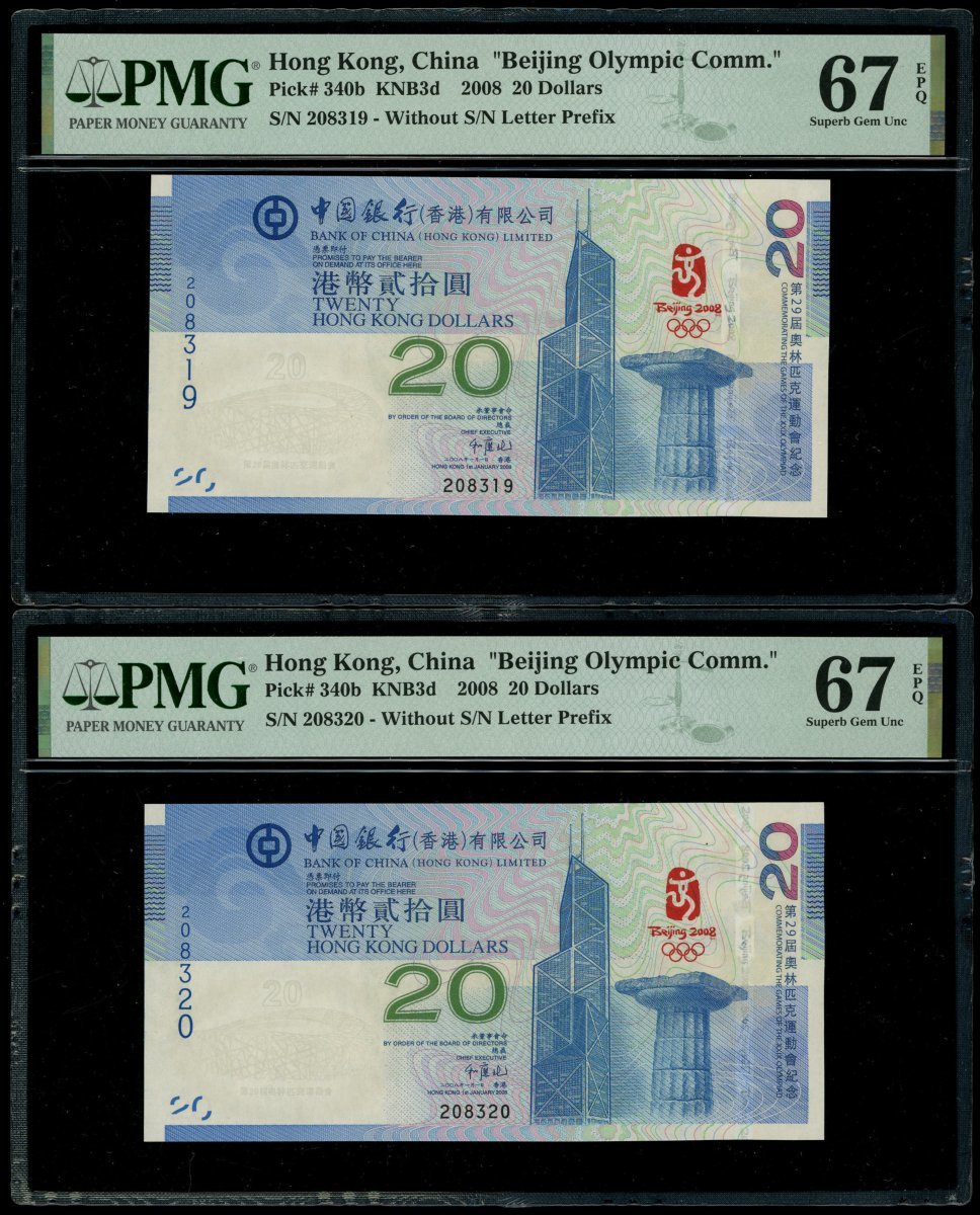 Bank of China, a pair of $20, 1.1.2008, consecutive serial numbers 208319-320, (Pick 340b), both graded PMG 67EPQ Superb Gem Uncirculated (2)