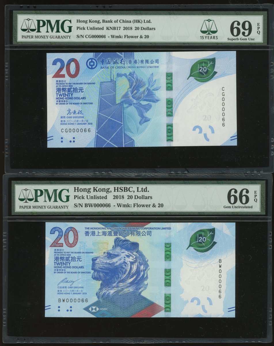 2018年中國銀行及匯豐銀行20元一對,相同細編號CG000066 及 BY000066,分別評PMG 69EPQ 及 66EPQ