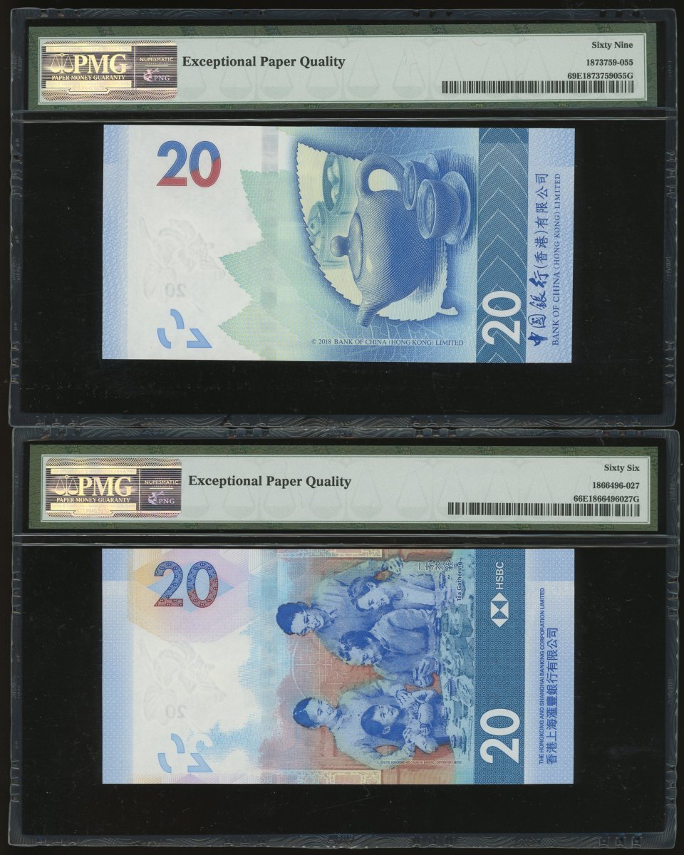 Bank of China and HSBC $20, 1.1.2018, matching low serial numbers CG000066 and BW000066, PMG 69EPQ and 66EPQ respectively (2)