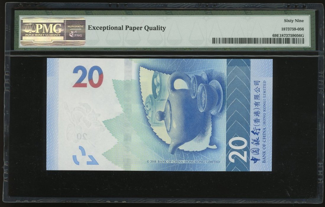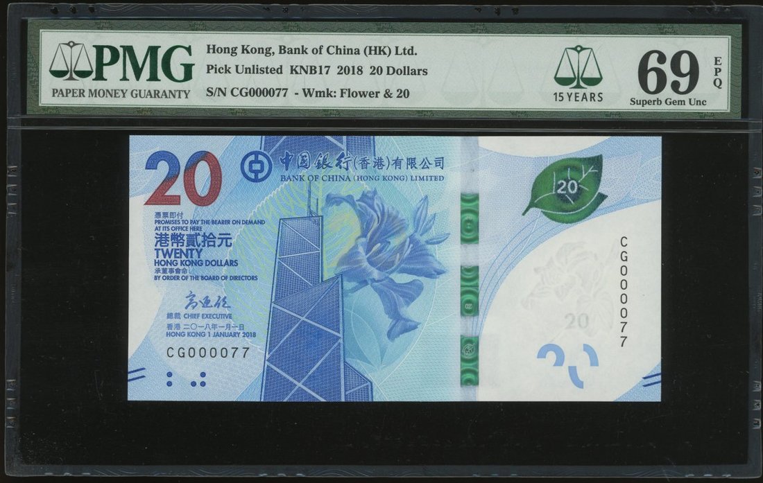 Bank of China, $20, 1.1.2018, low serial number CG000077, PMG 69EPQ Superb Gem Uncirculated and extremely choice