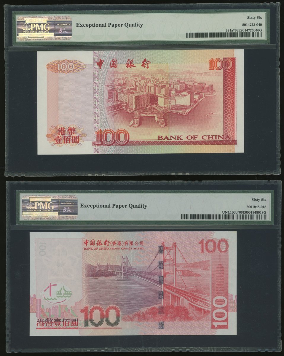Bank of China, a pair of $100, 1.5.1994 and 1.1.2008, replacement serials ZZ002085 and ZY251031, (Pick 331a*, 337e*), both graded PMG 66EPQ Gem Uncirculated (2)