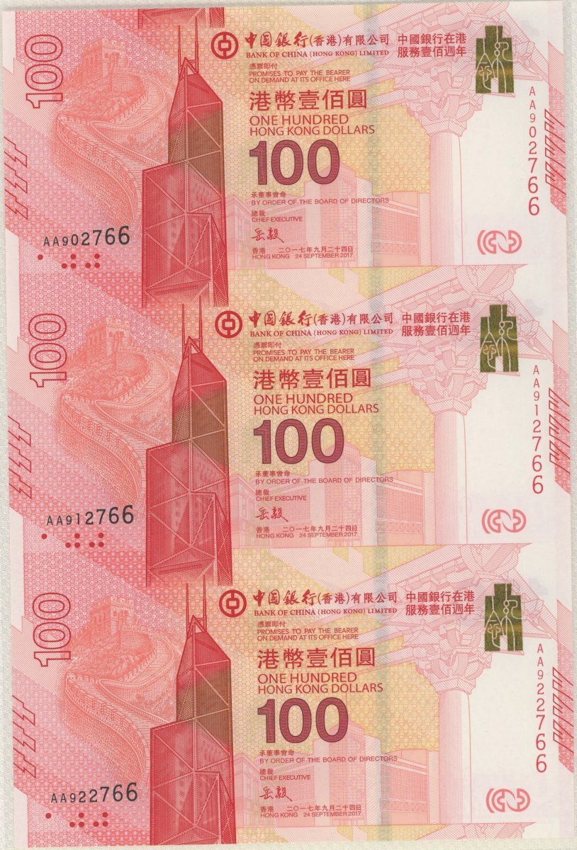 Bank of China, $100, 24.9.2017, an uncut sheet of 3 notes, 100th Anniversary of Bank of China' presence in Hong Kong, serial numbers AA902766, AA912766 and AA922766, (Pick 347(1)), Uncirculated, with original folder.