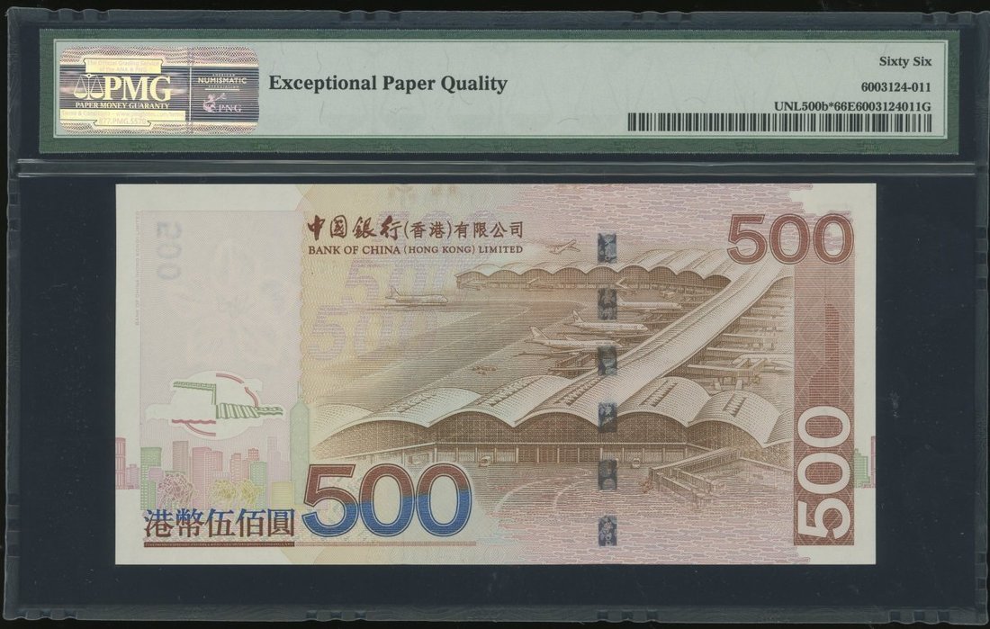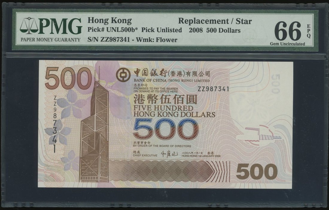 Bank of China, $500. 1.1.2008, replacement serial number ZZ987341, (Pick 338e), PMG 66EPQ Gem Uncirculated.