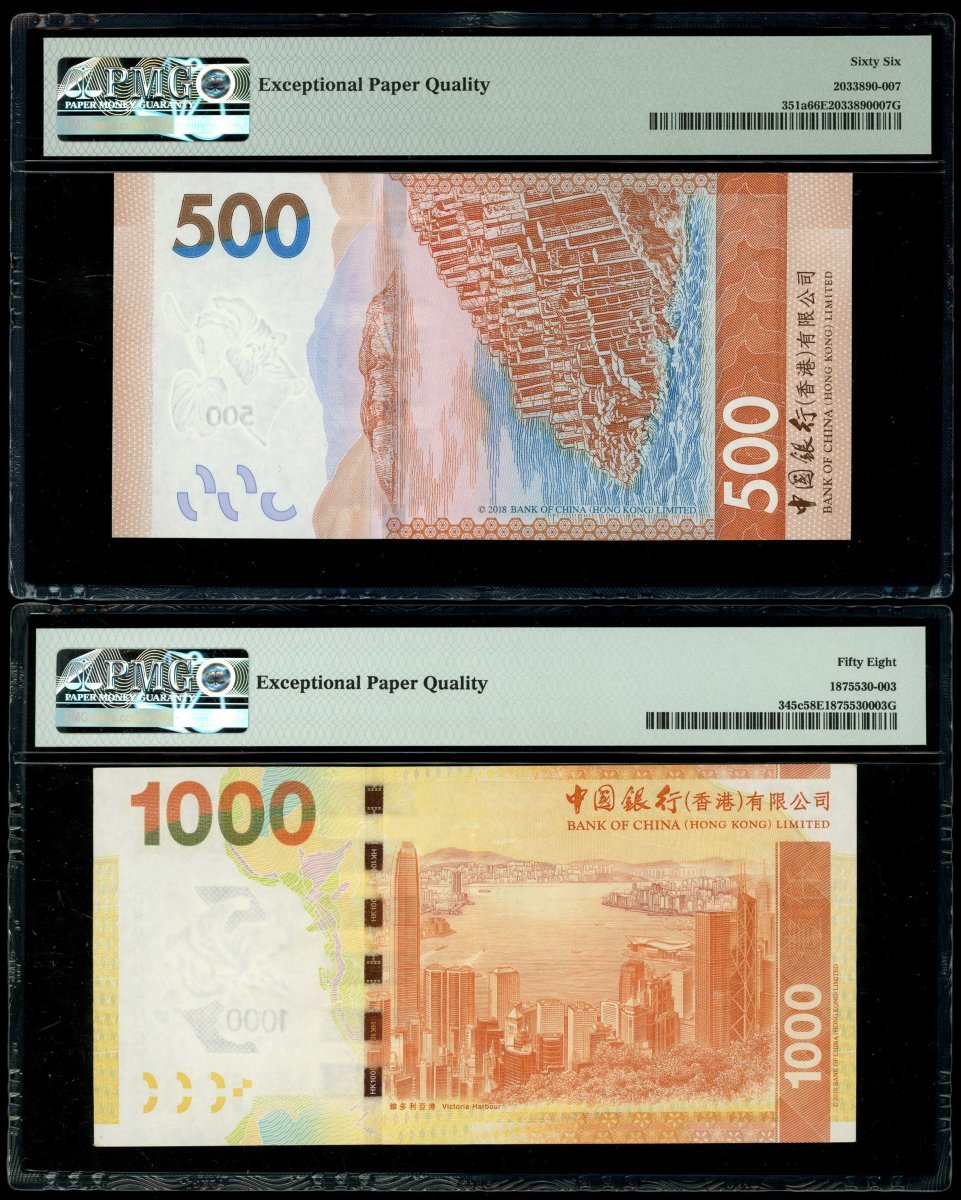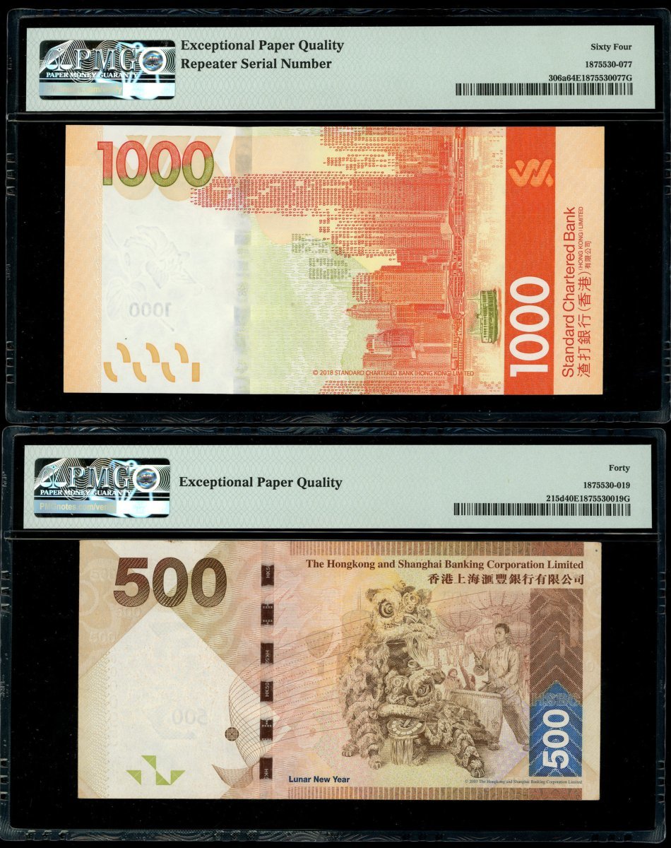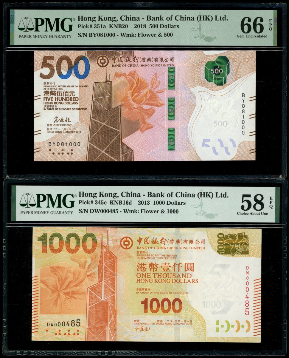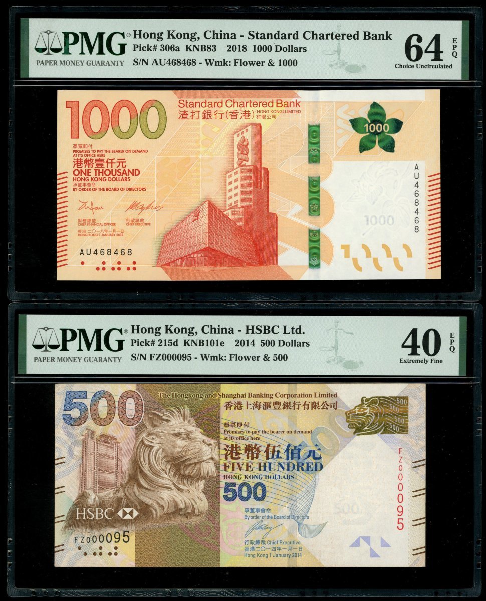 香港趣味號紙鈔一組4枚,包括2018年中國銀行500元,渣打銀行2013年1000元,2018年1000元,及2014年香港上海匯豐銀行500元,分別為趣味號BY081000,細編號DW000485,重複號AU468468及細編號FZ000095,分別評PMG 66EPQ,58EPQ,64EPQ及40EPQ