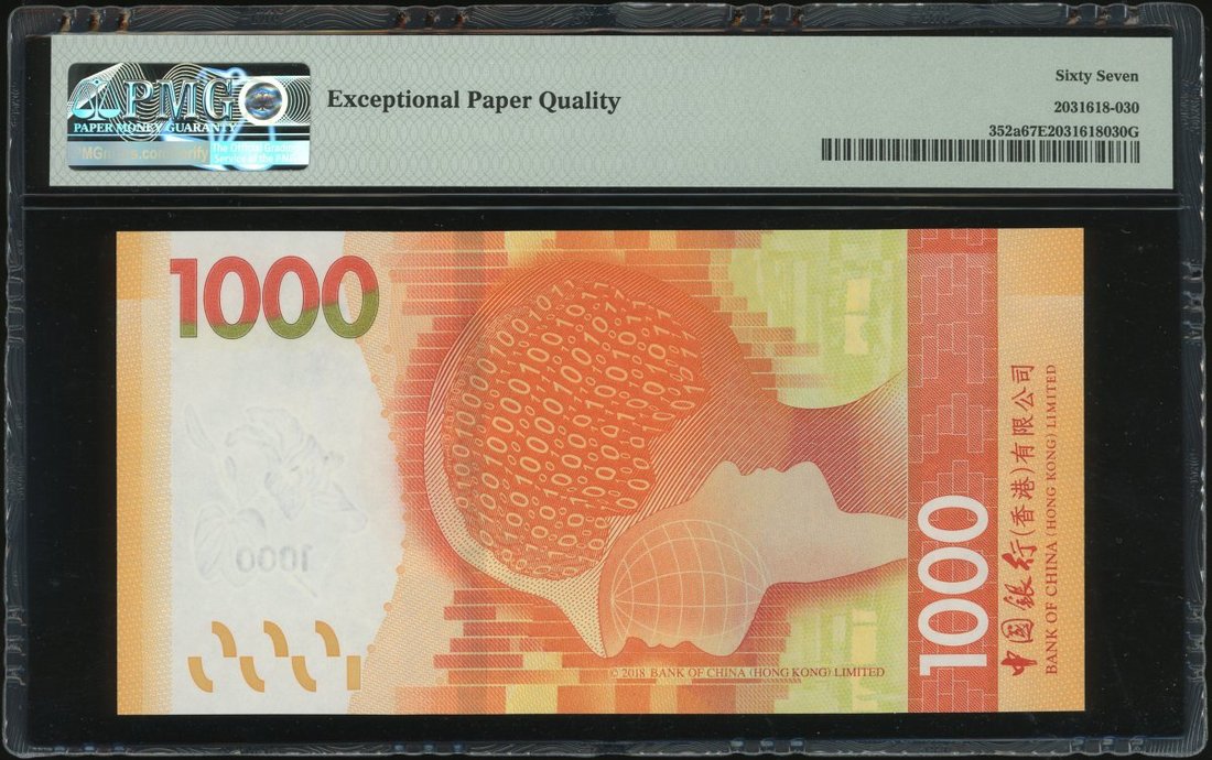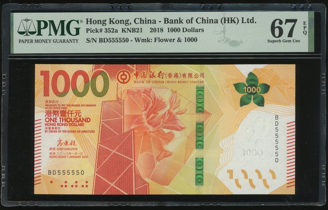 Bank of China, $1000, 1.1.2018, near solid number BD555550, (Pick 352a), PMG 67EPQ Superb Gem Uncirculated
