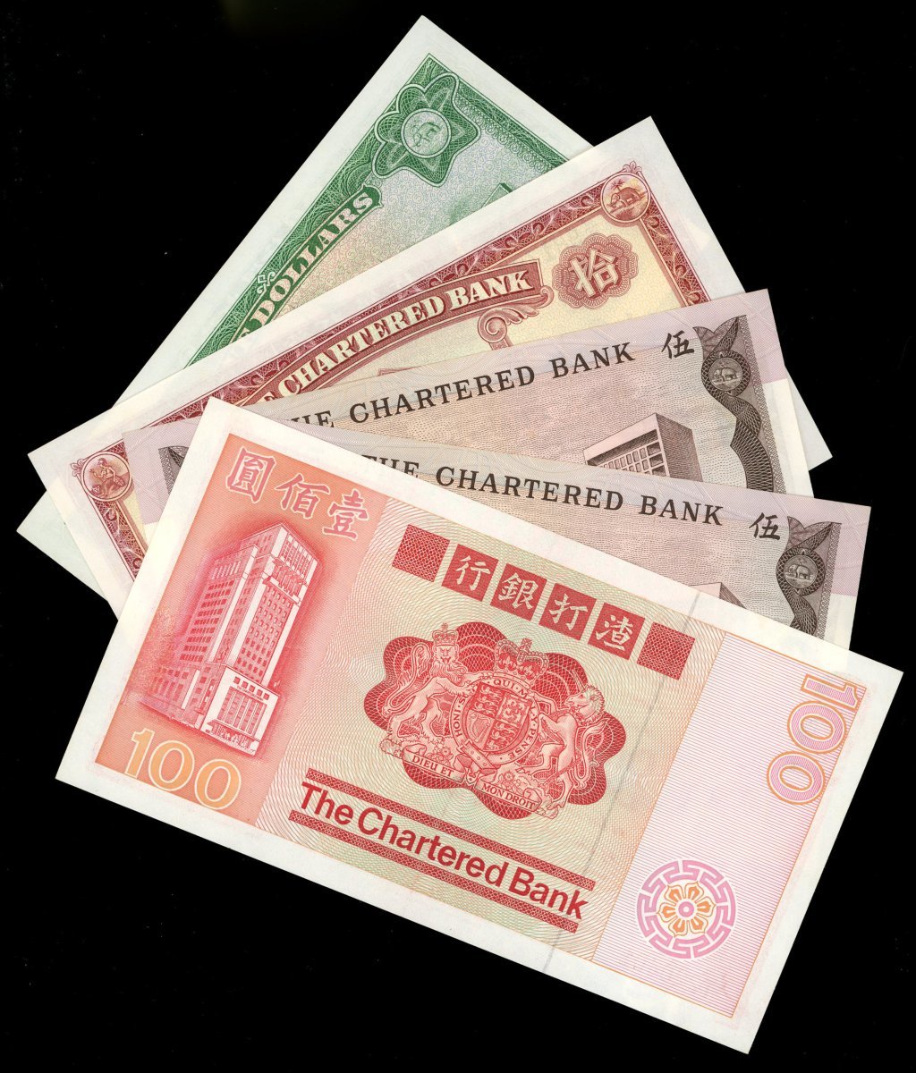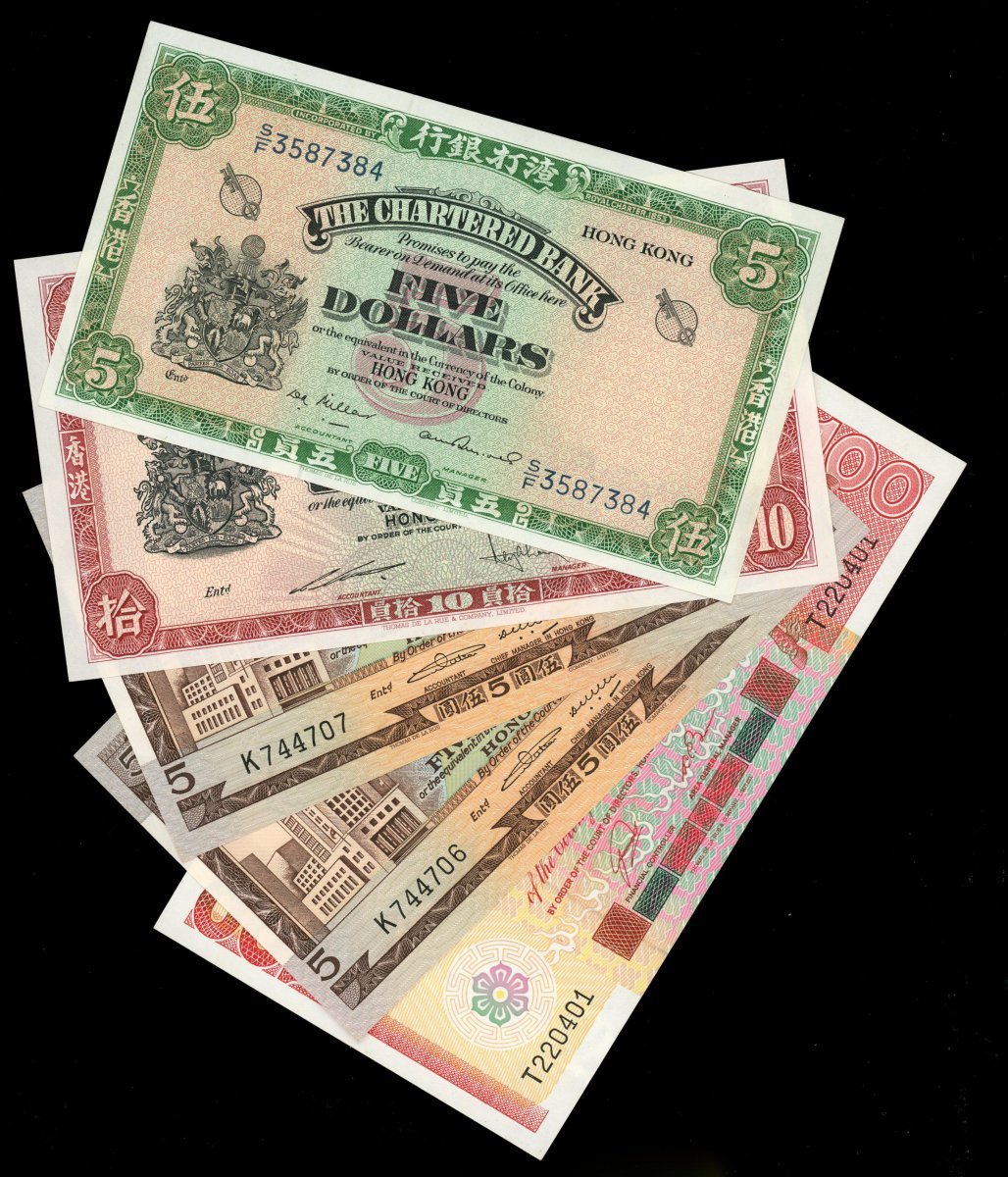 1960-1980年代渣打銀行紙幣一組5枚,包括1962-1970年5元,1970-75年5元2枚,1962-1970年10元,1982年100元,100元EF有壓過,其餘AU至UNC