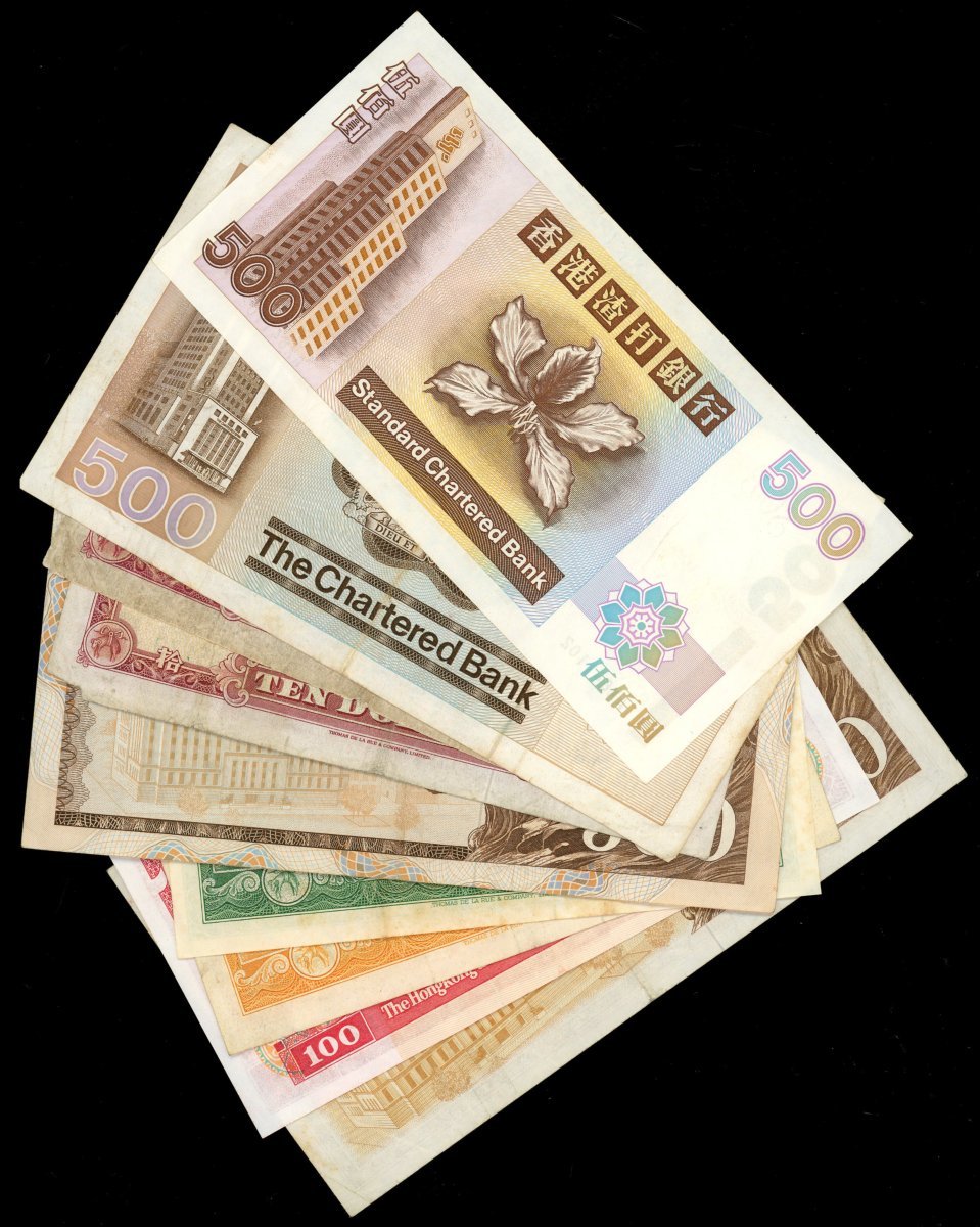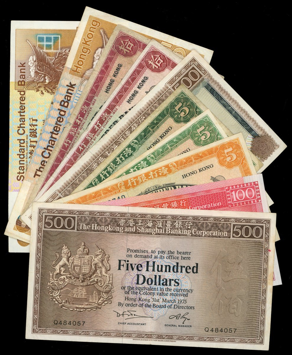 香港紙鈔一組10枚,來自渣打銀行及香港上海匯豐銀行,面值2135元,GVF品相