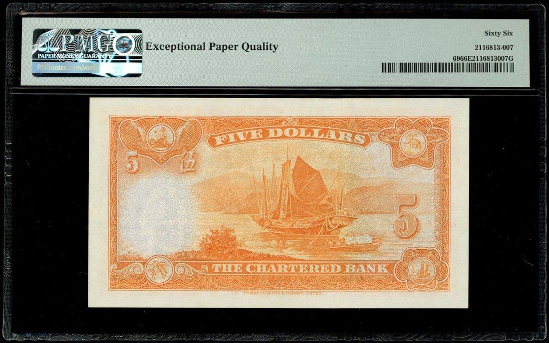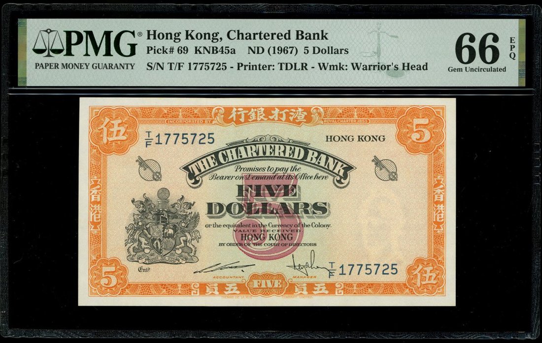 1967年渣打銀行5元,無日期,編號T/F 1775725,PMG 66EPQ