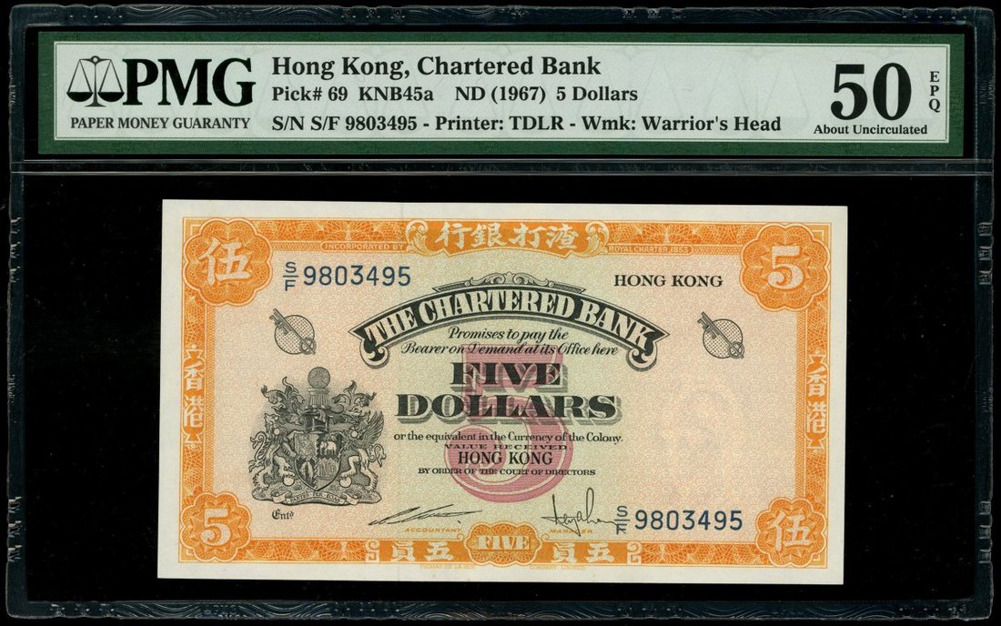 1967年渣打銀行5元,無日期,編號S/F 9803495,PMG 50EPQ