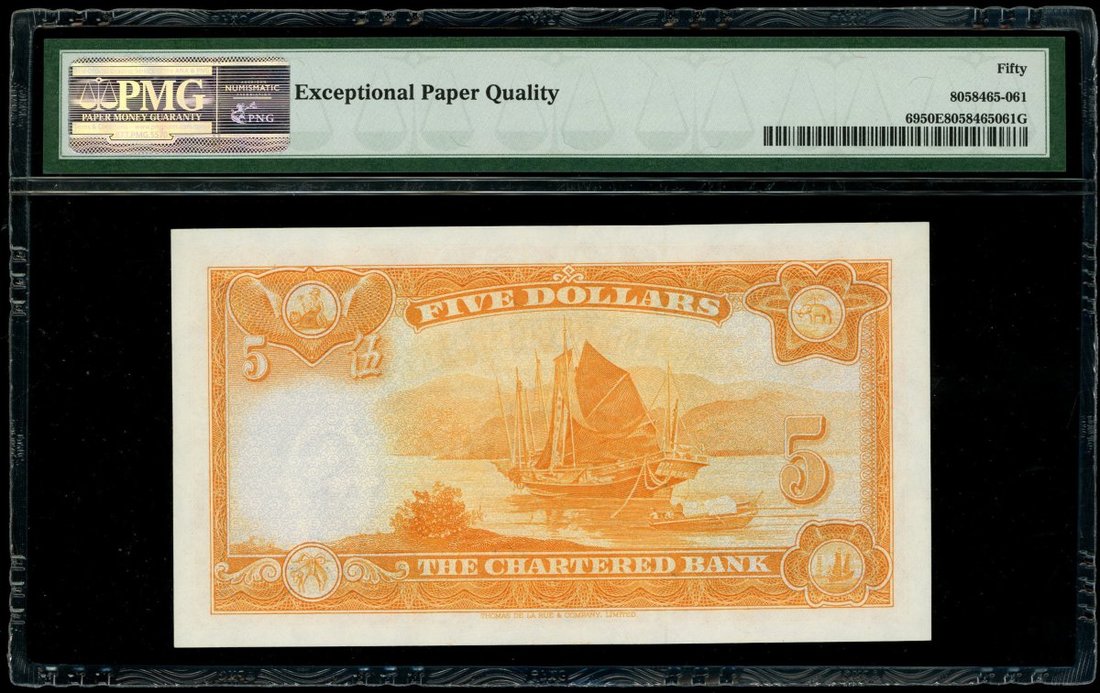 The Chartered Bank, $5, ND (1967), serial number S/F 9803495, (Pick 69), PMG 50EPQ About Uncirculated