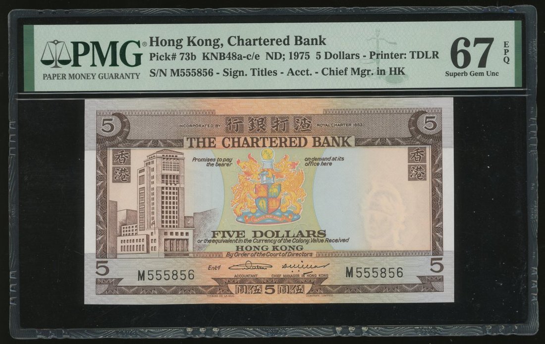 The Chartered Bank, $5, ND (1975), serial number M555856, (Pick 73b), PMG 67EPQ Superb Gem Uncirculated