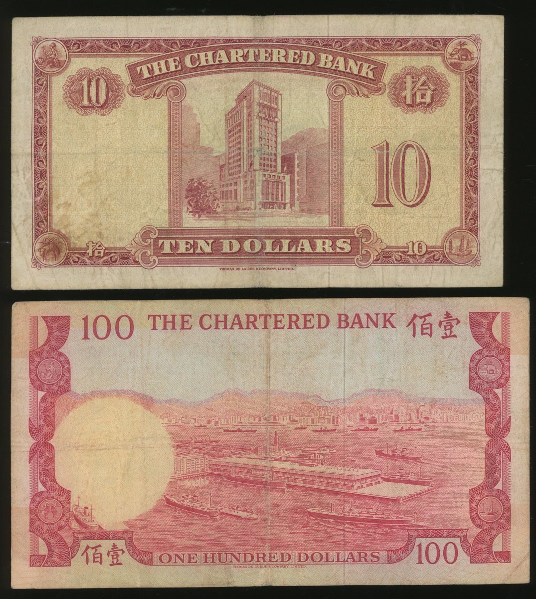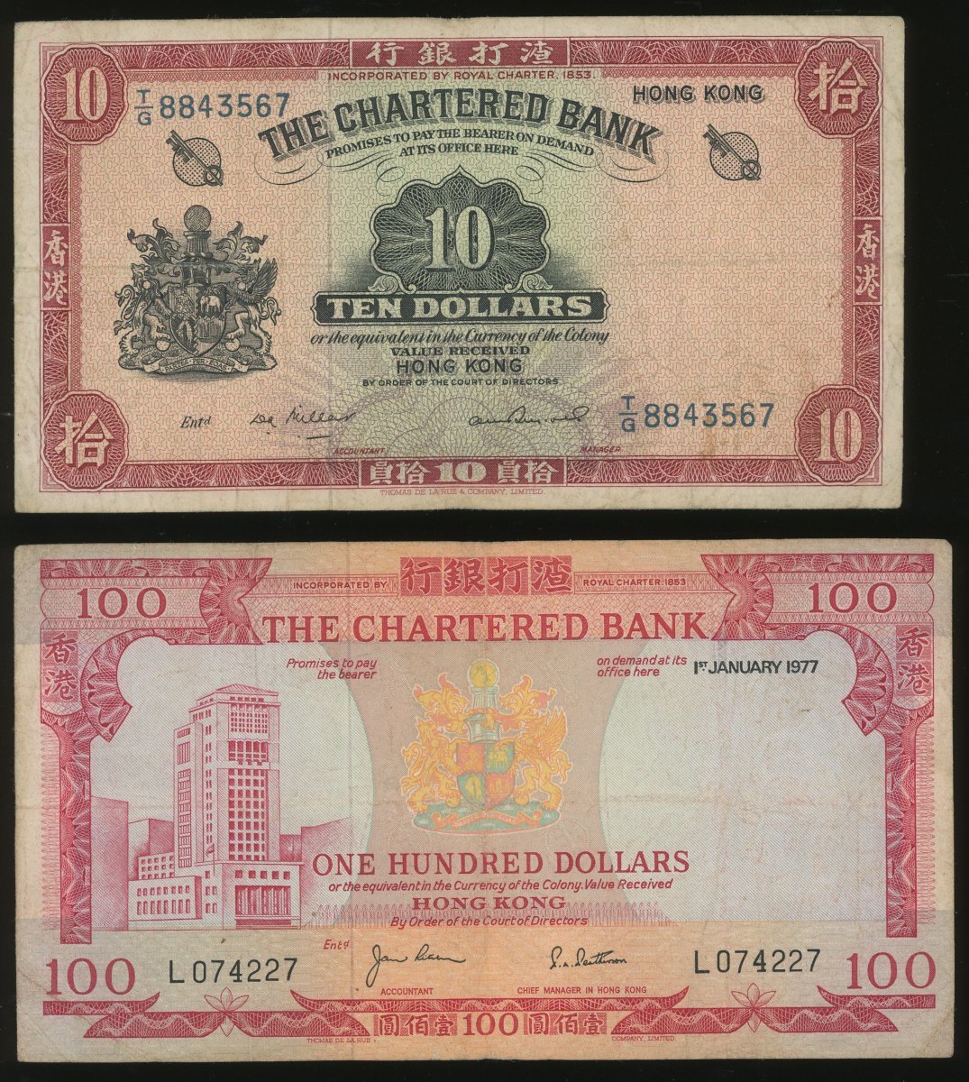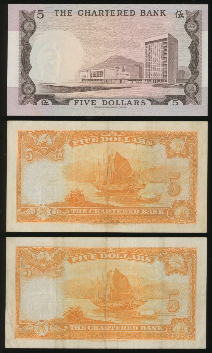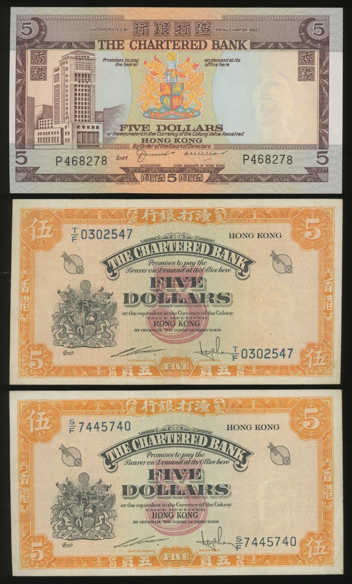 The Chartered Bank, a group of 5x notes, consists of $5, ND(1967) (2), ND(1970-75) (1), $10, ND (1962-1970), and $100, 1977, serial numbers S/F 7445740, T/F 0302547, P468278, T/G8843567 and L074227,