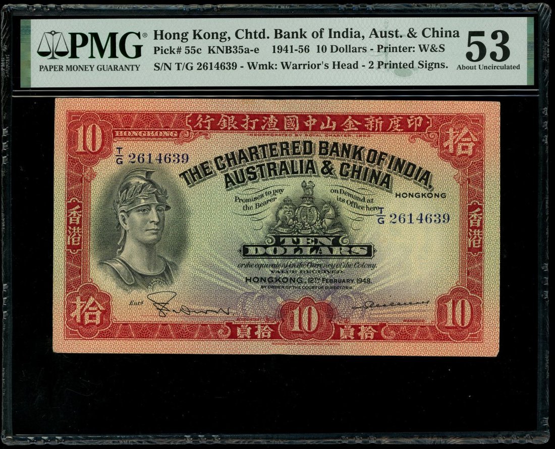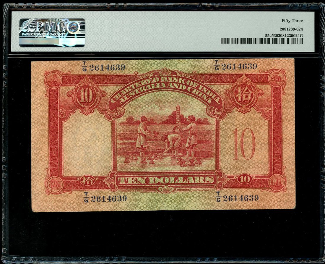 1948年印度新金山中國渣打銀行10元,編號T/G 2614639,2個機印署名,PMG 53,顏色深潤明亮