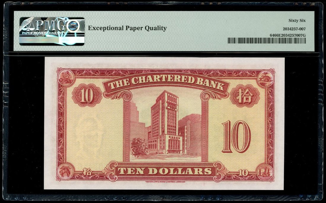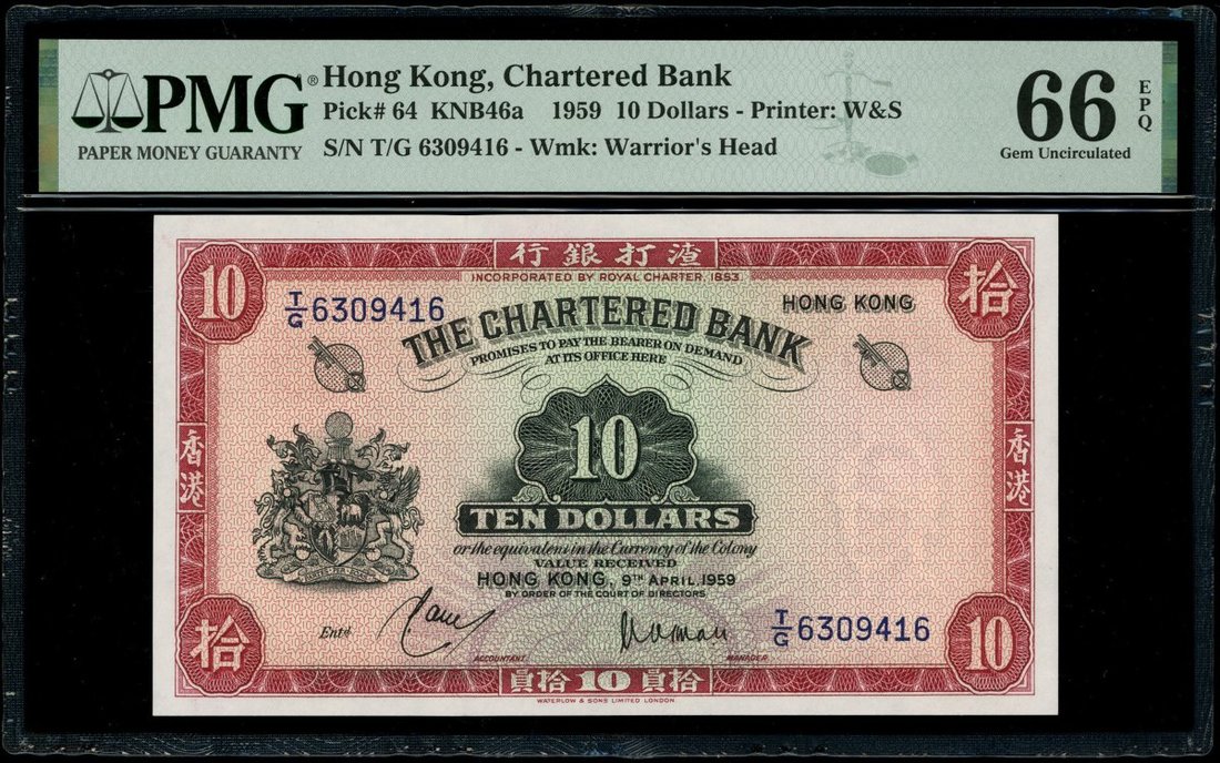 1959年渣打銀行10元,編號T/G 6309416,PMG 66EPQ,罕見首發年份,大熱版別
