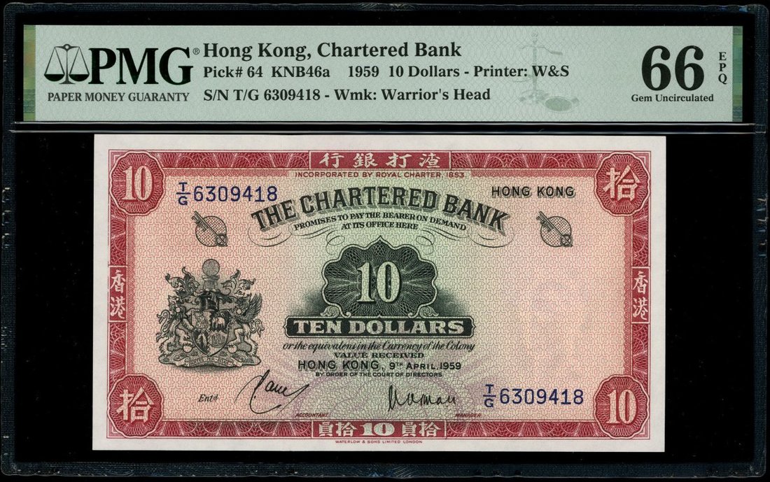 1959年渣打銀行10元,編號T/G 6309418,PMG 66EPQ,罕見首發年份,大熱版別