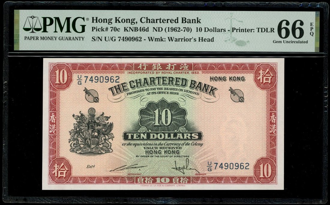 1962-70年渣打銀行10元,無日期,編號U/G 7490962,PMG 66EPQ