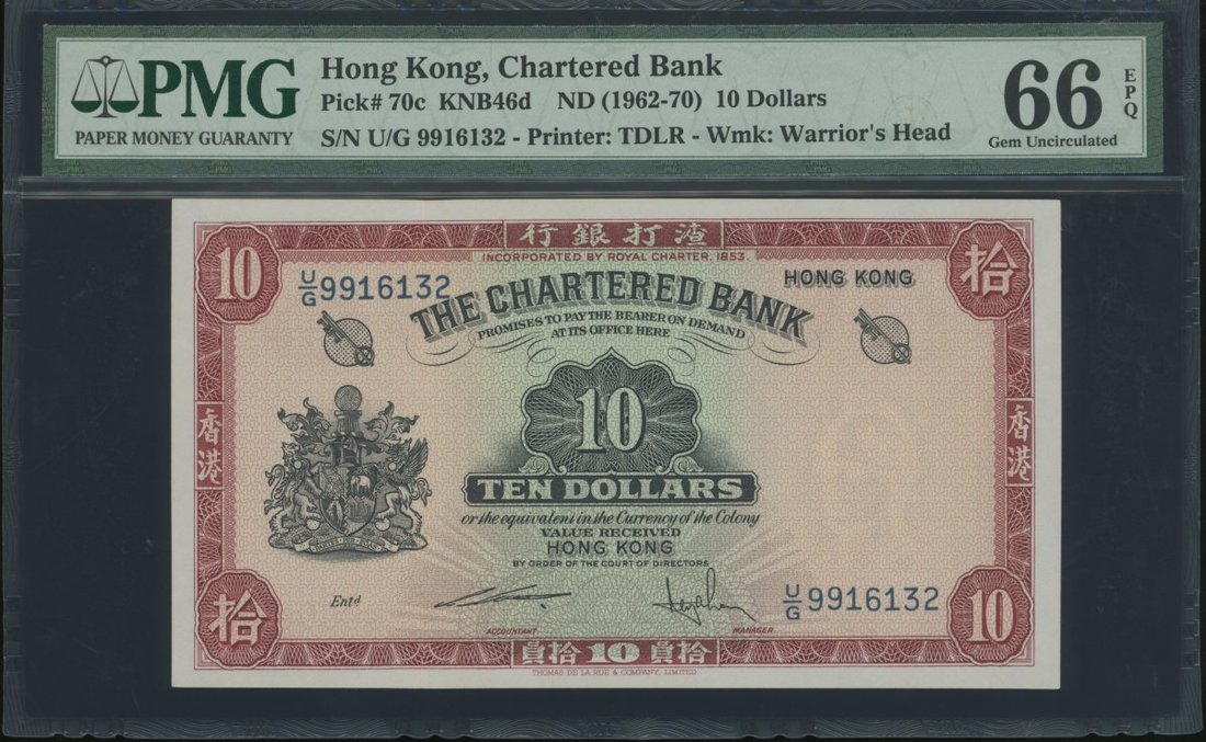 The Chartered Bank, $10, no date (1962-70), serial number U/G 9916132, (Pick 70c), PMG 66EPQ Gem Uncirculated
