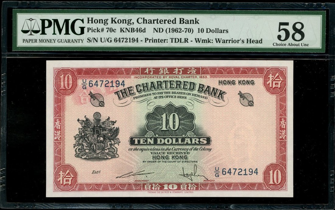 1962-70年渣打銀行10元,無日期,黏印錯體,編號U/G6472194,PMG 58