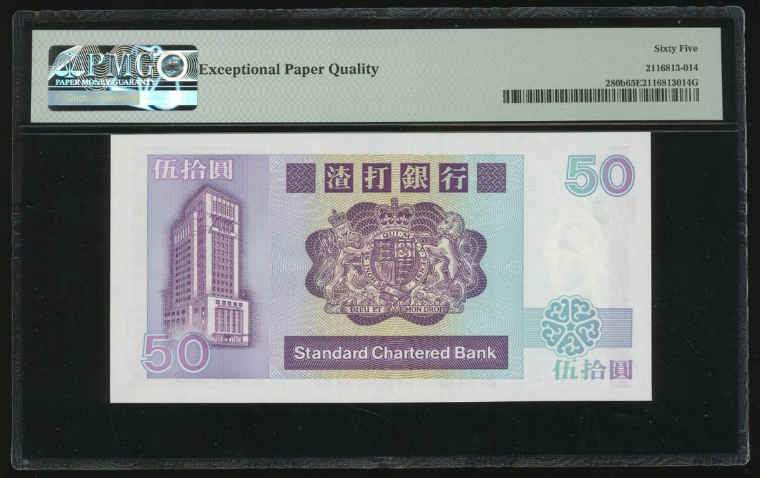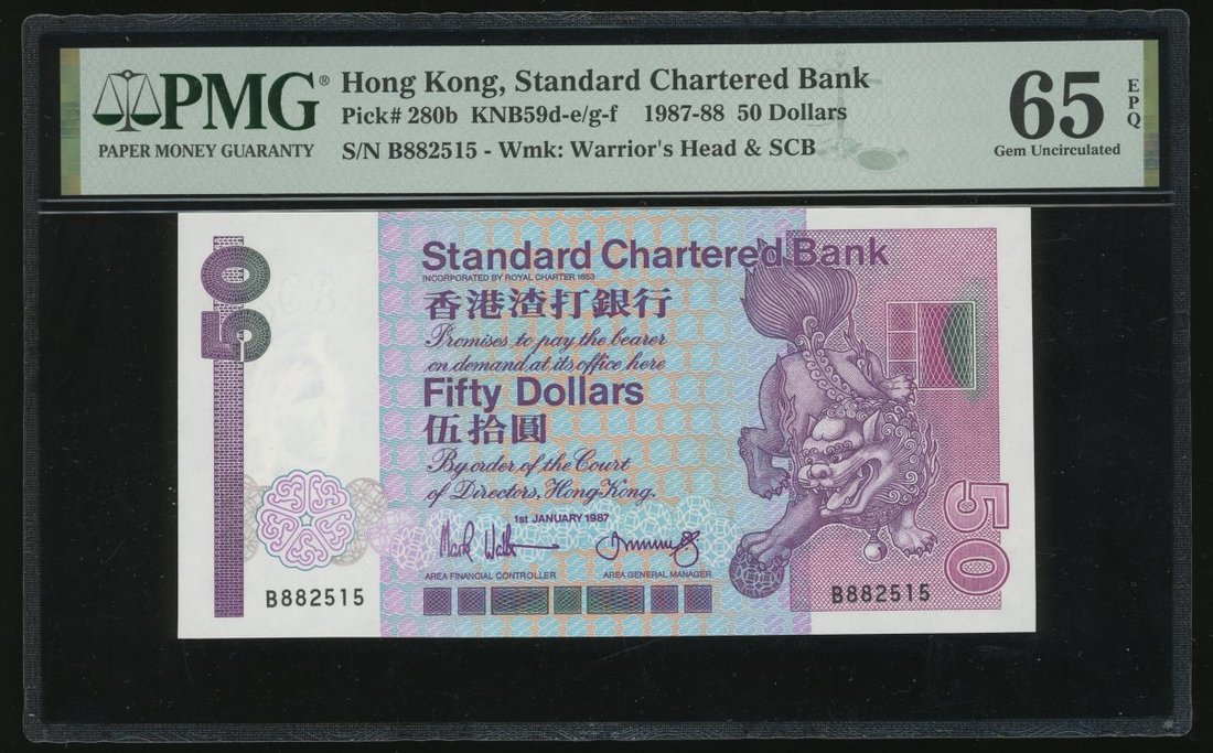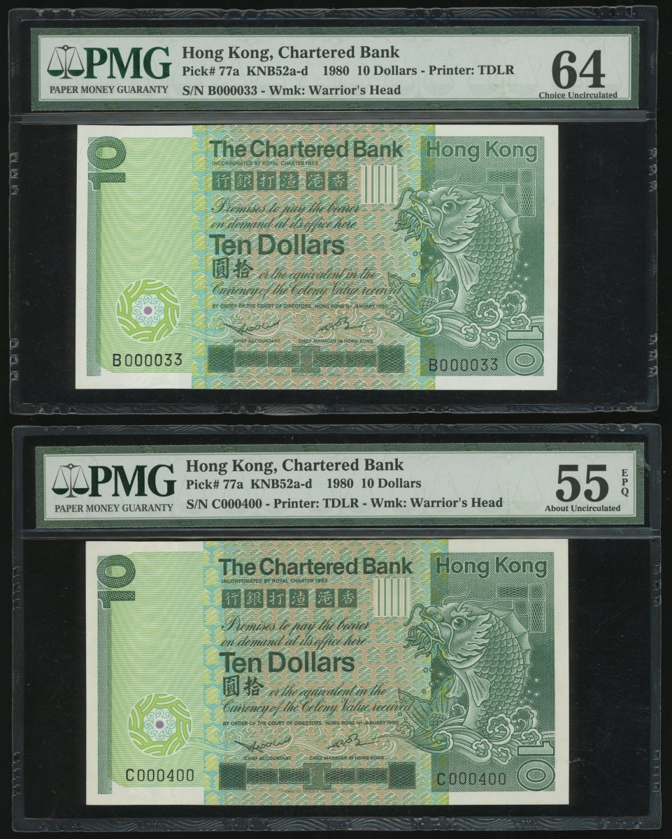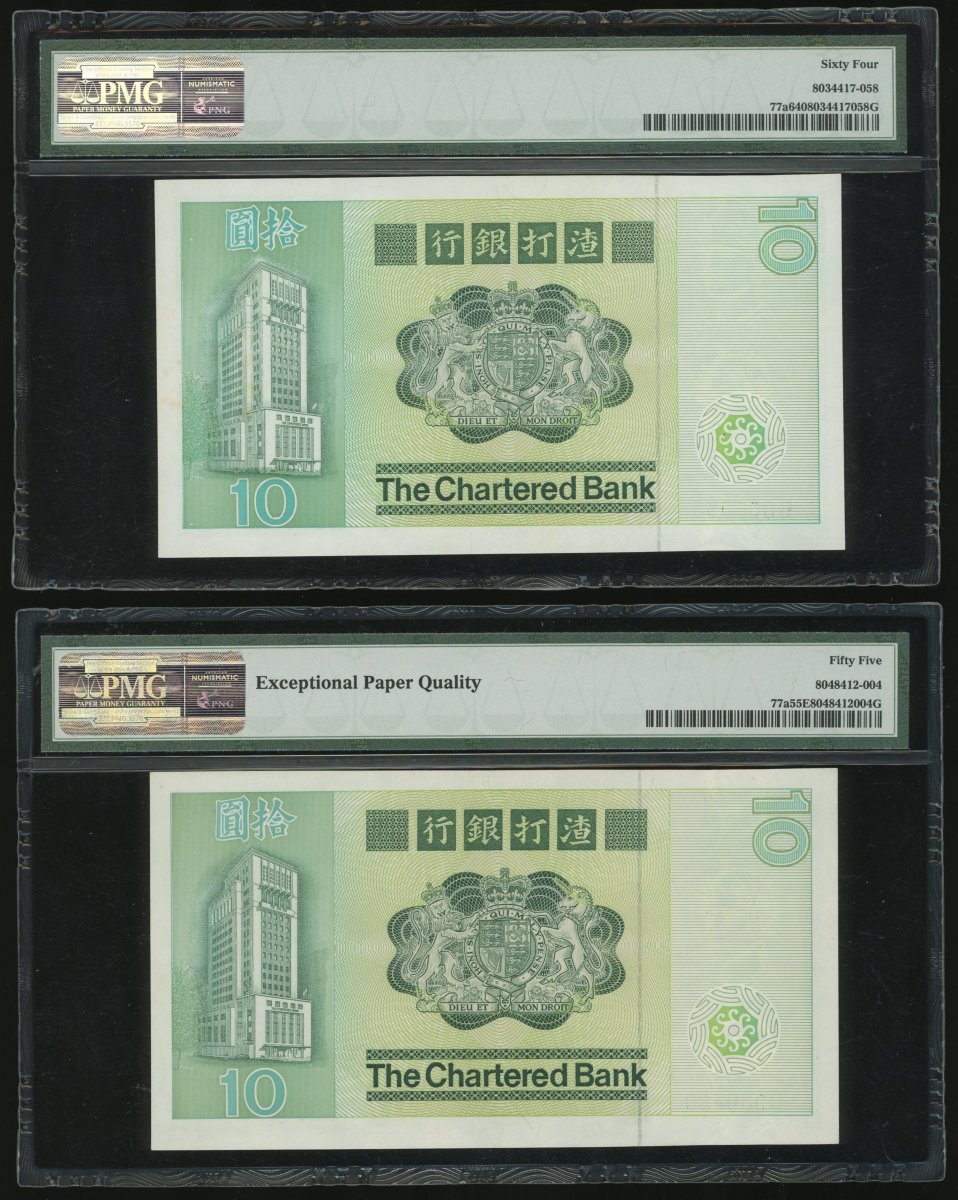 渣打銀行一組3枚,包括1980年10元2枚,細號B000033及C000400,以及1987年50元,B字軌編號B882515,評PMG 64,55EPQ及65EPQ