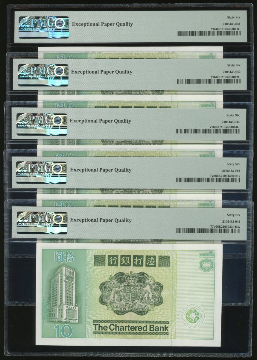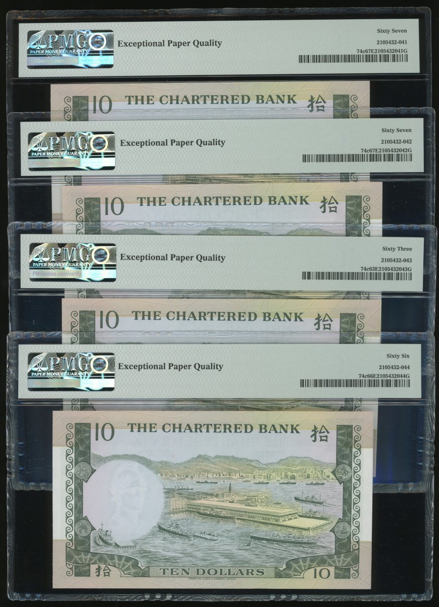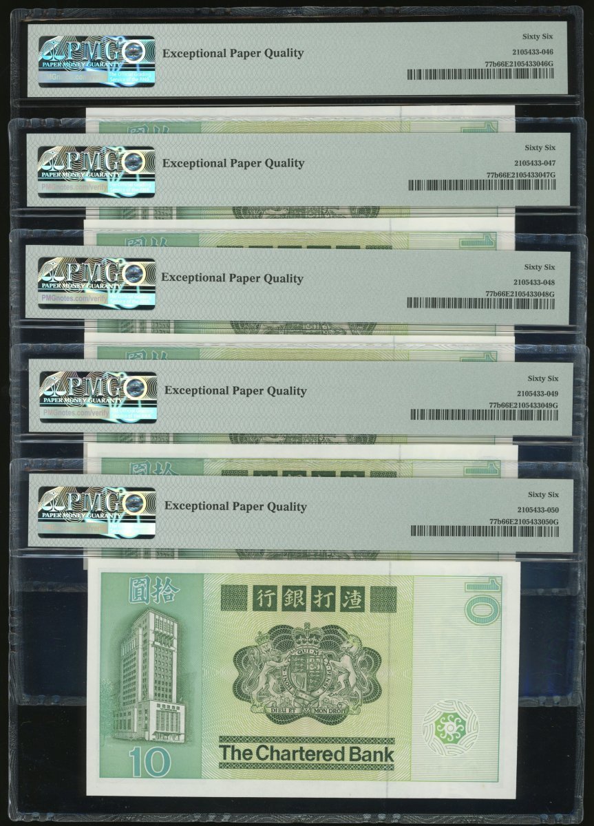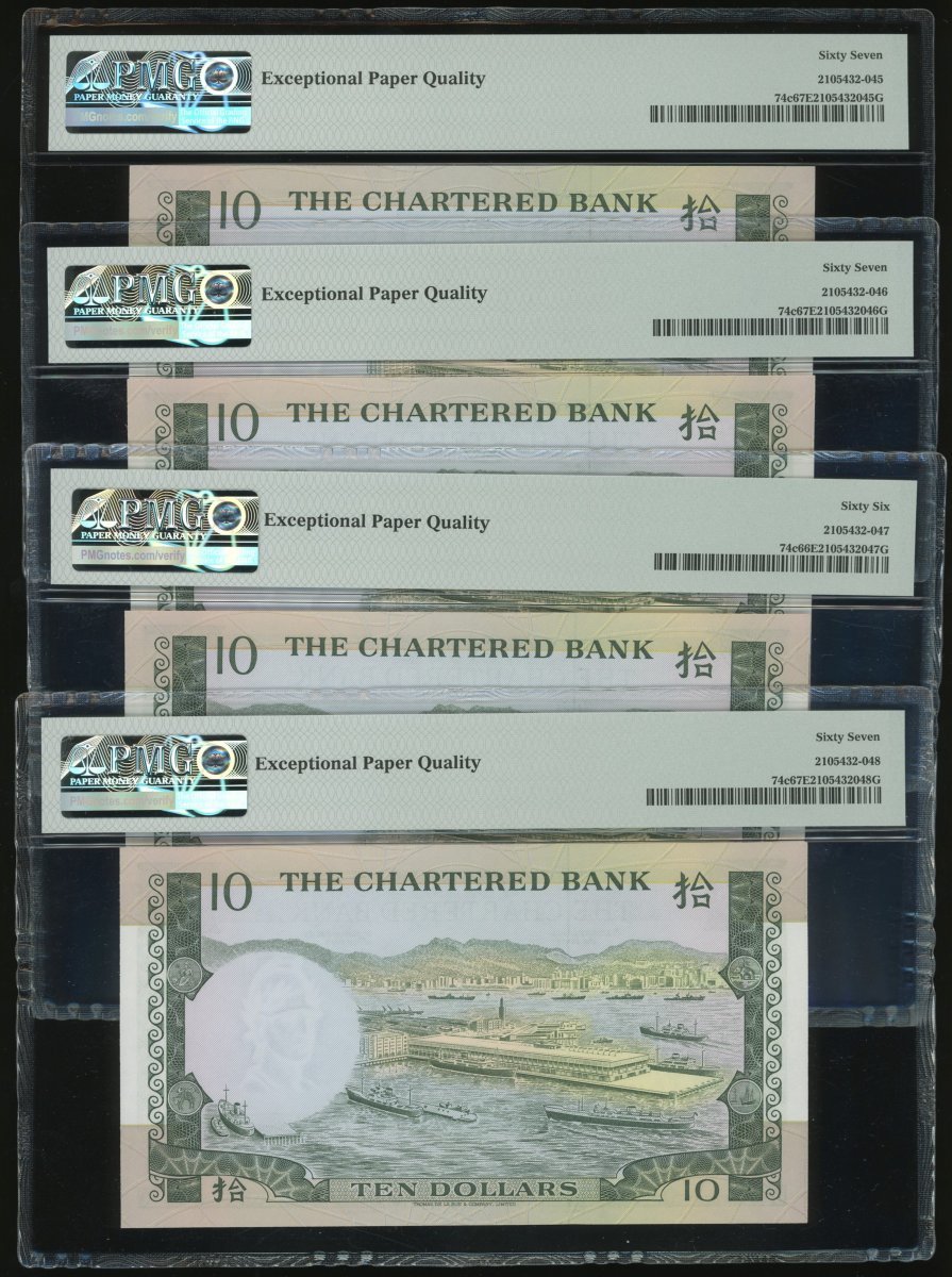 渣打銀行10元一組18枚,包括1977年8枚,及1981年10枚,編號D9258141-146,148,150及AT61941-950,1977年10元,1枚評PMG 63EPQ,2枚評PMG 66EPQ,5枚評67EPQ,1981年全為PMG 66EPQ