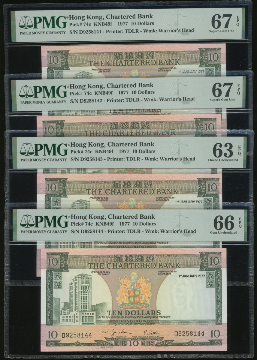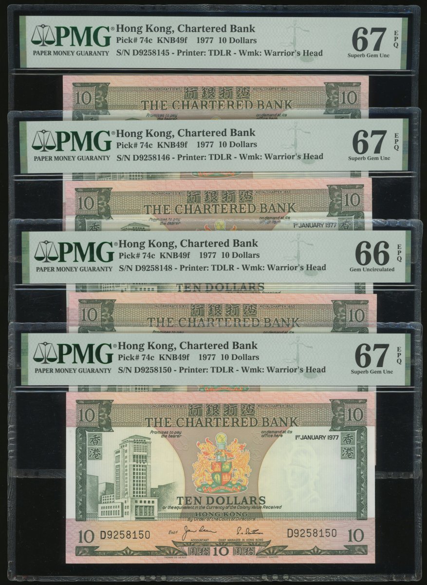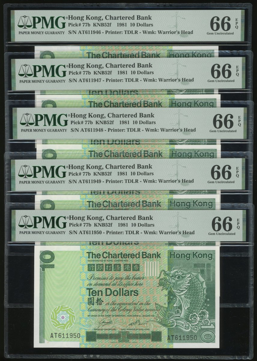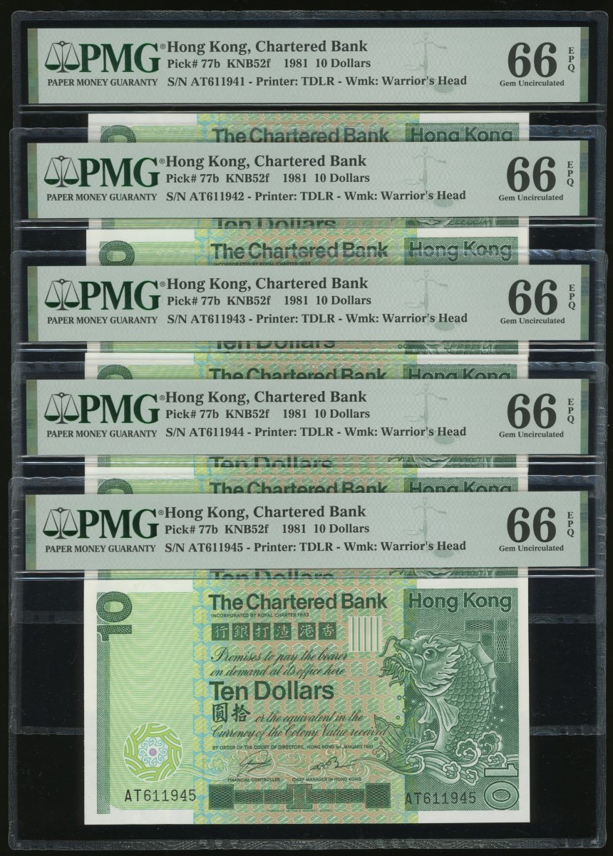 渣打銀行10元一組18枚,包括1977年8枚,及1981年10枚,編號D9258141-146,148,150及AT61941-950,1977年10元,1枚評PMG 63EPQ,2枚評PMG 66EPQ,5枚評67EPQ,1981年全為PMG 66EPQ