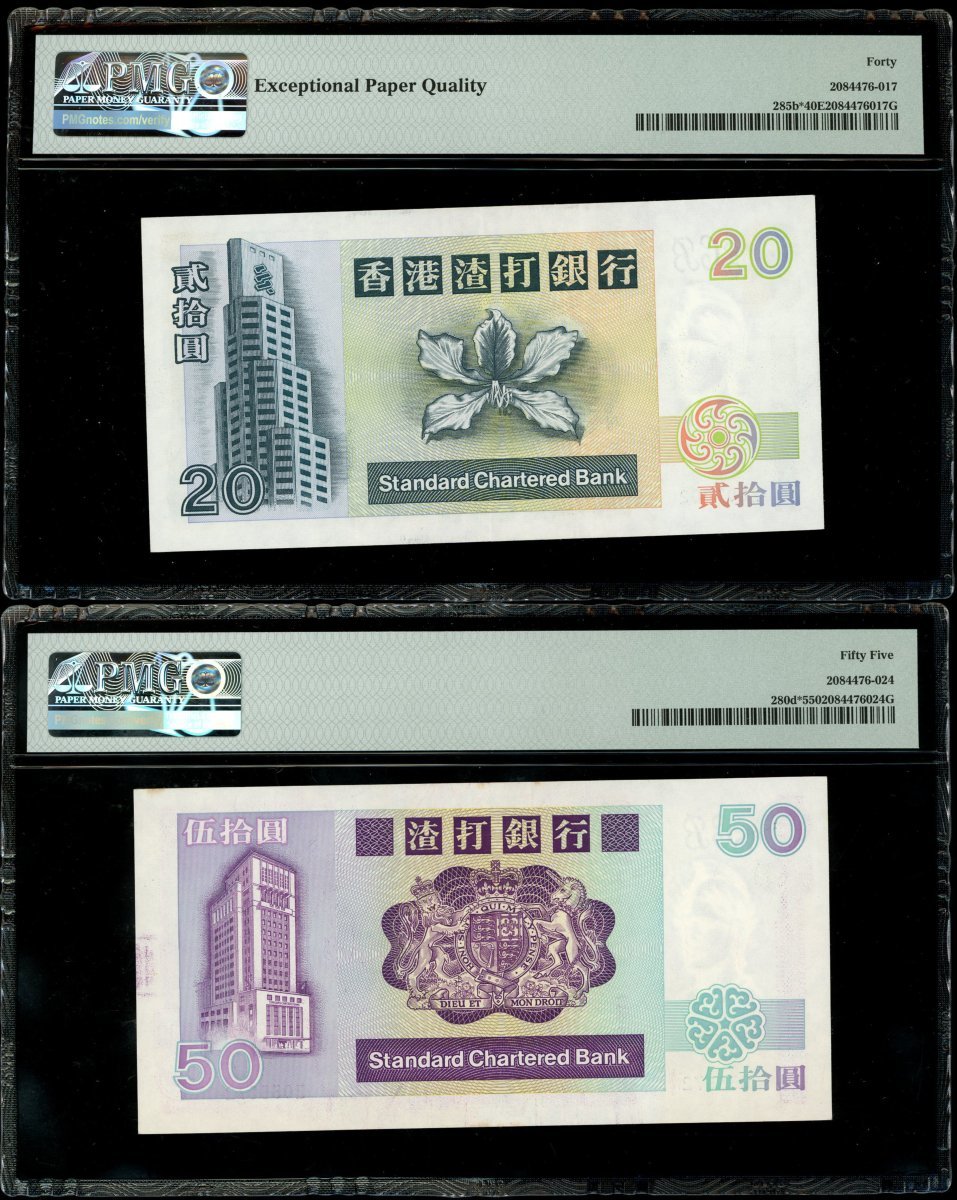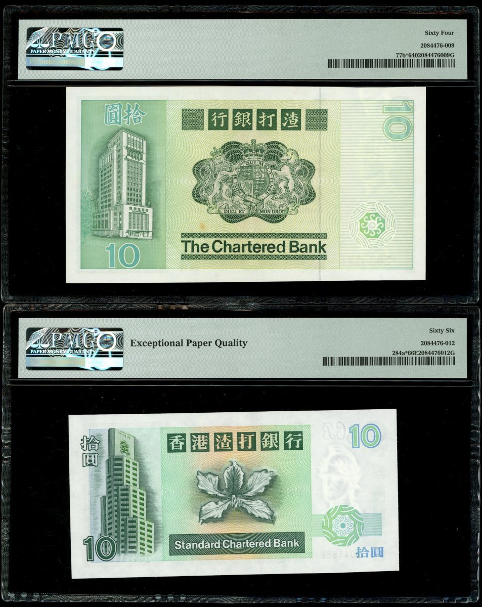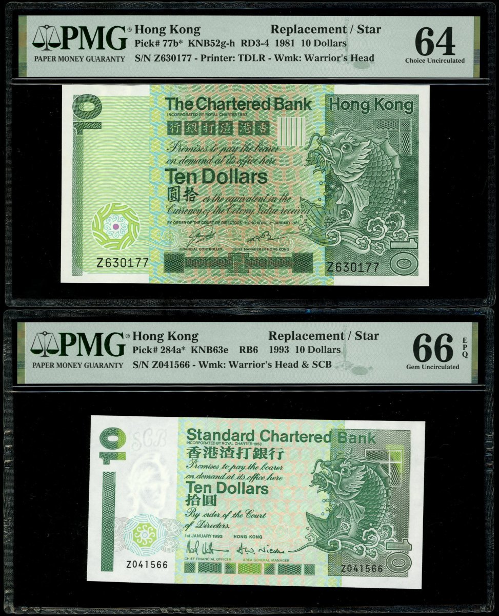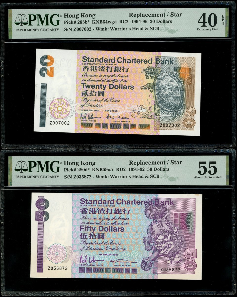 渣打銀行補版票一組4枚,包括1981及93年10元,1994年20元,及1991年50元,編號Z630177,Z041566,Z007002及Z035872,分別評PMG 64,66EPQ,40EPQ及55