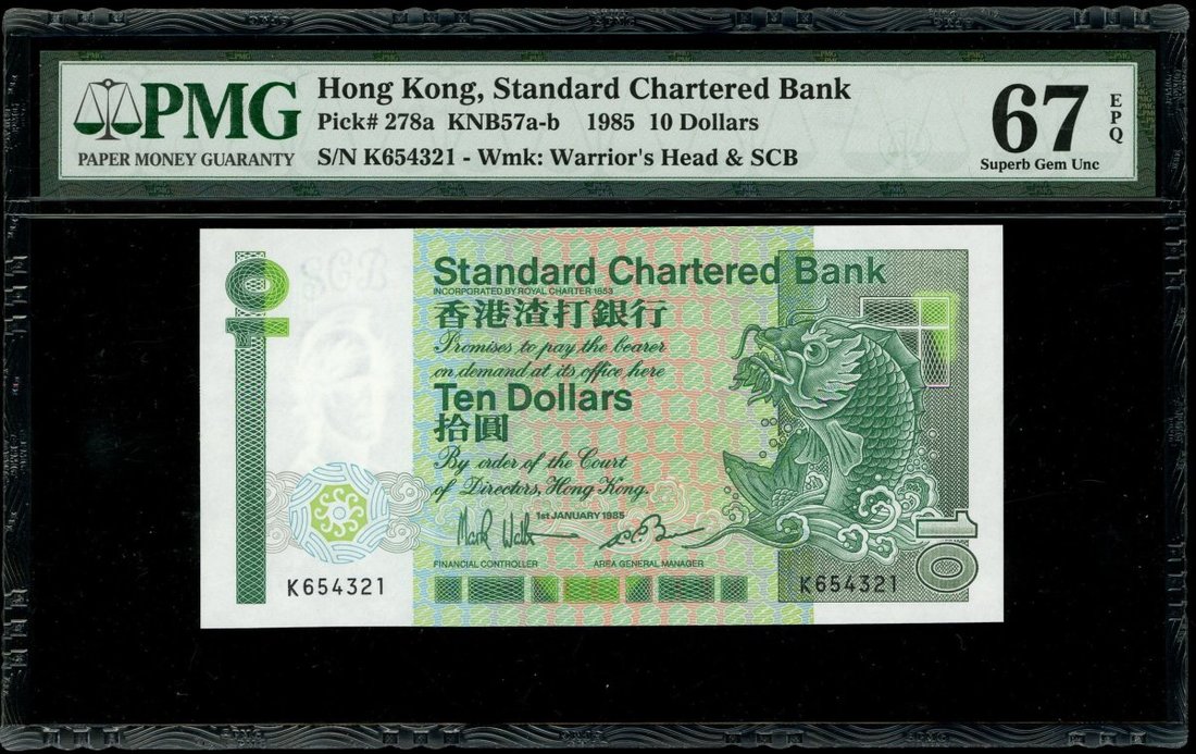 Standard Chartered Bank, $10, 1.1.1985, descending ladder number K654321, (Pick 278a), PMG 67EPQ Superb Gem Uncirculated.