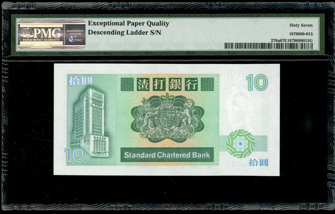 1985年渣打銀行10元,倒蛇號 K654321,PMG 67EPQ