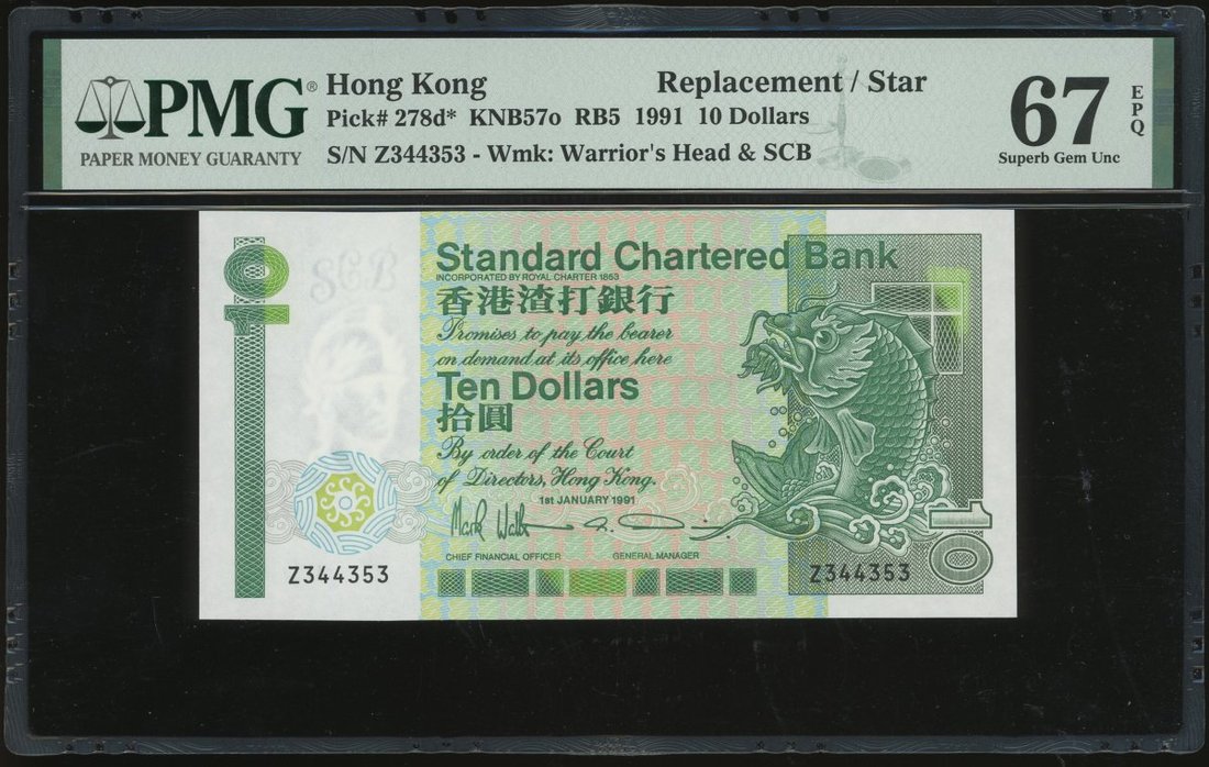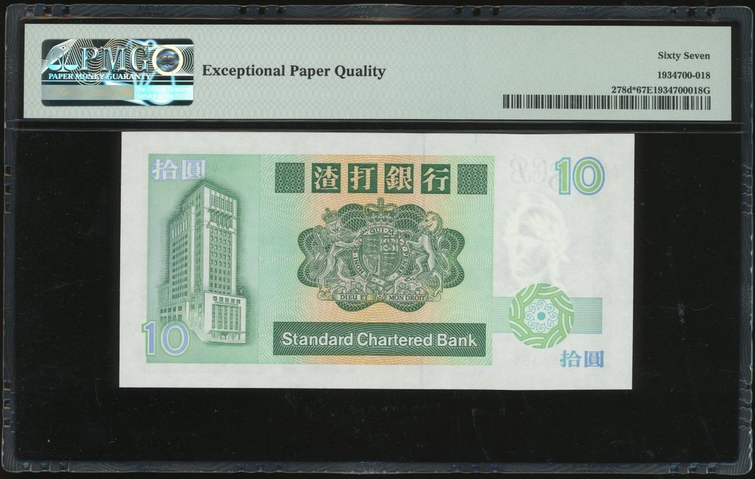 1991年渣打銀行補版10元,編號Z344353,PMG 67EPQ