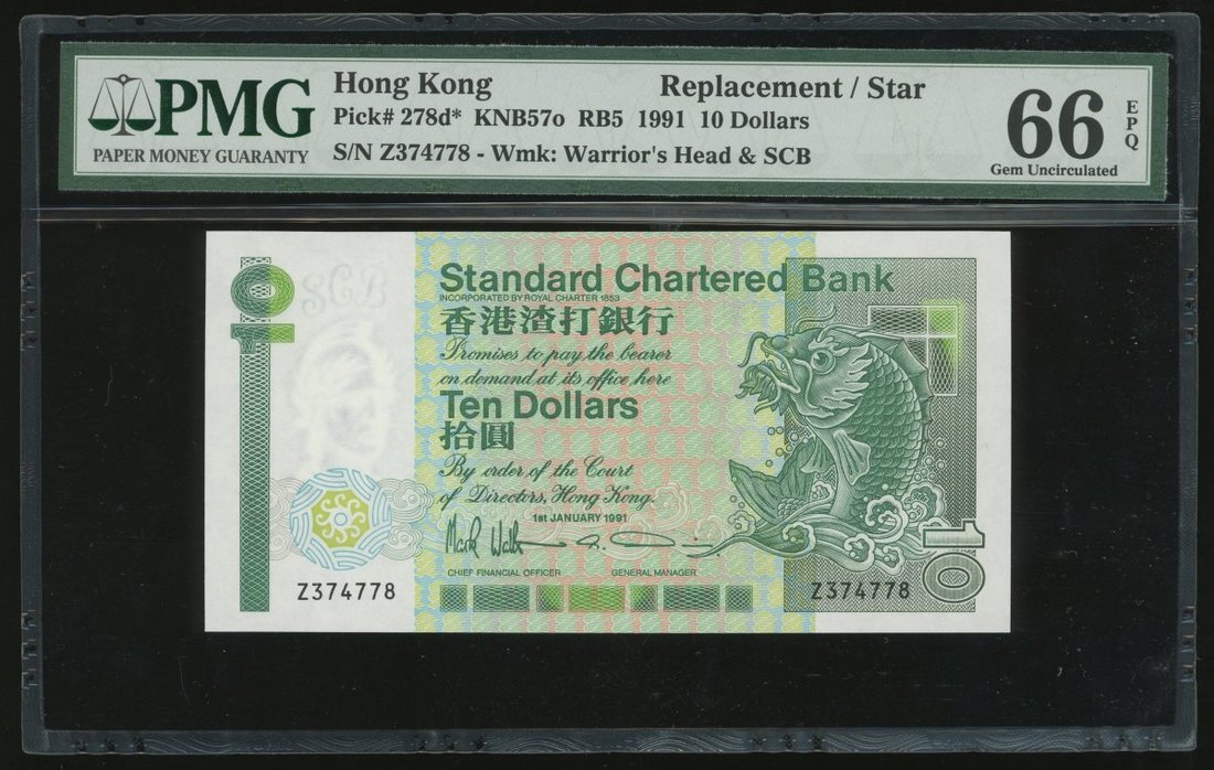Standard Chartered Bank, $10, 1.1.1991, replacement number Z374778, (Pick 278d*), PMG 66EPQ Gem Uncirculated