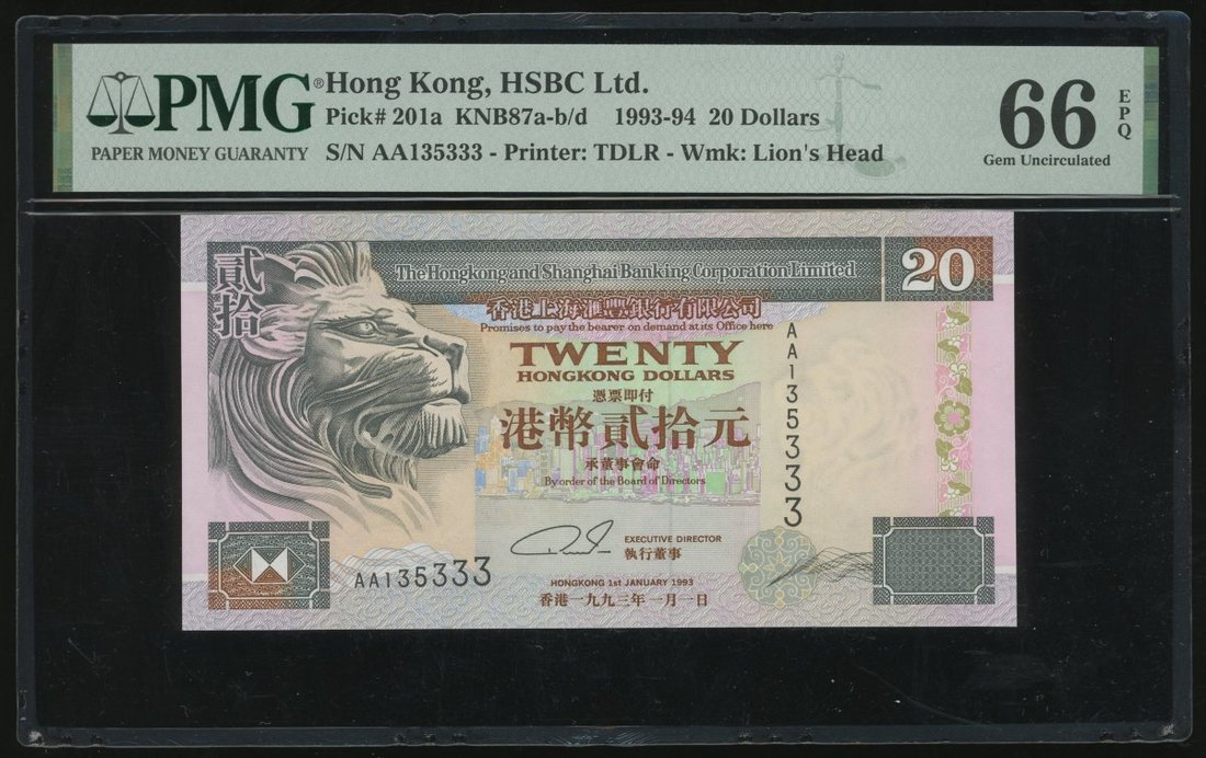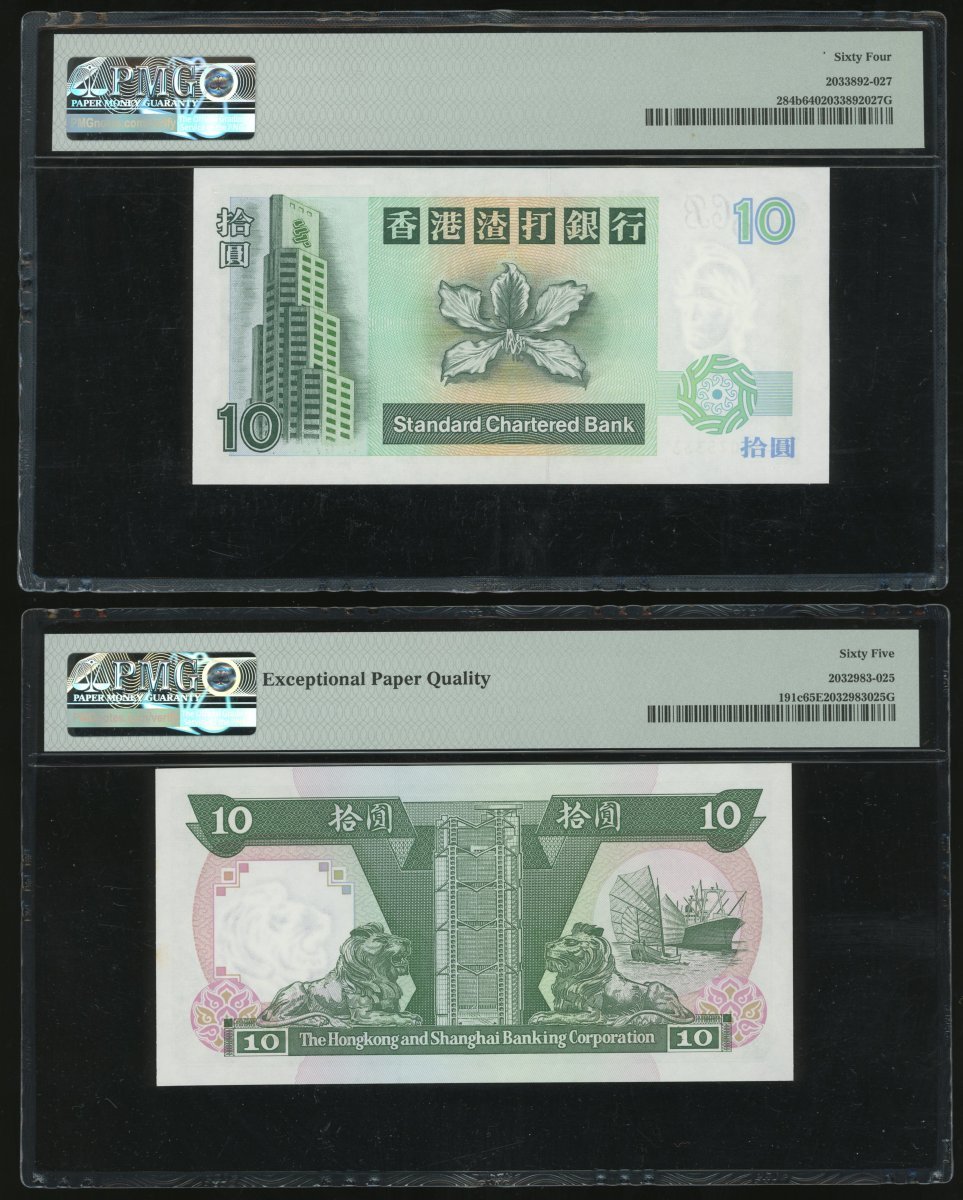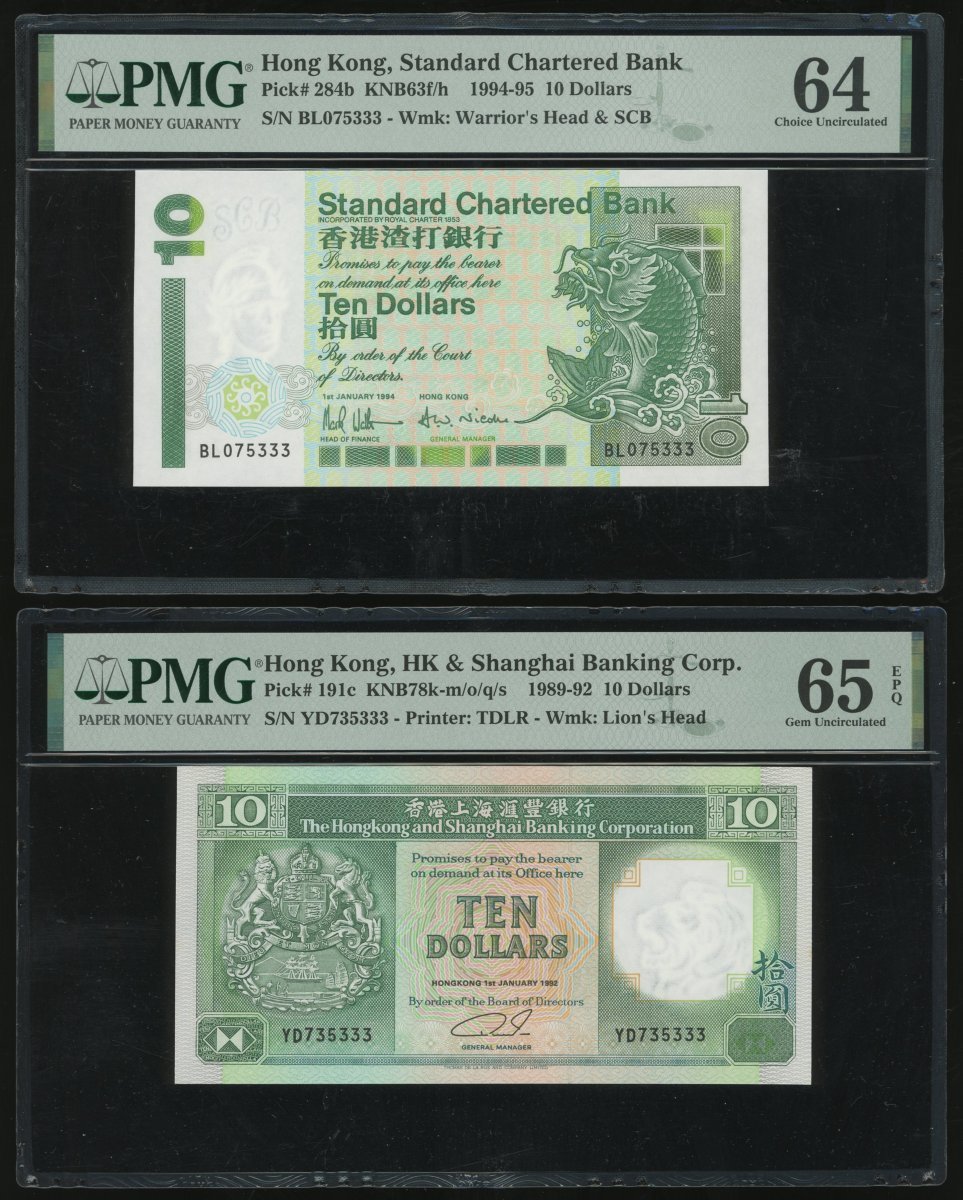 香港紙鈔一組3枚,包括1994年渣打銀行10元,1992年匯豐銀行10元及1993年20元,趣味號BL075333,YD735333及AA135333,分別評PMG 64,65EPQ及66EPQ