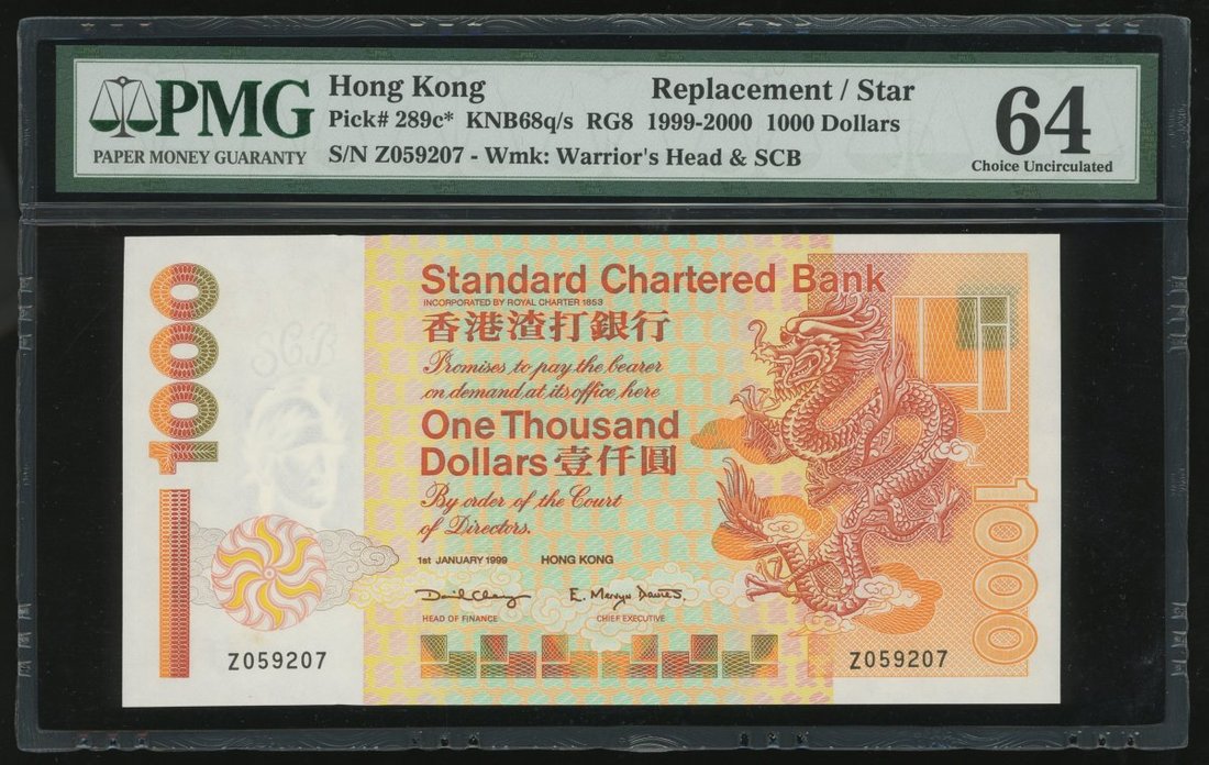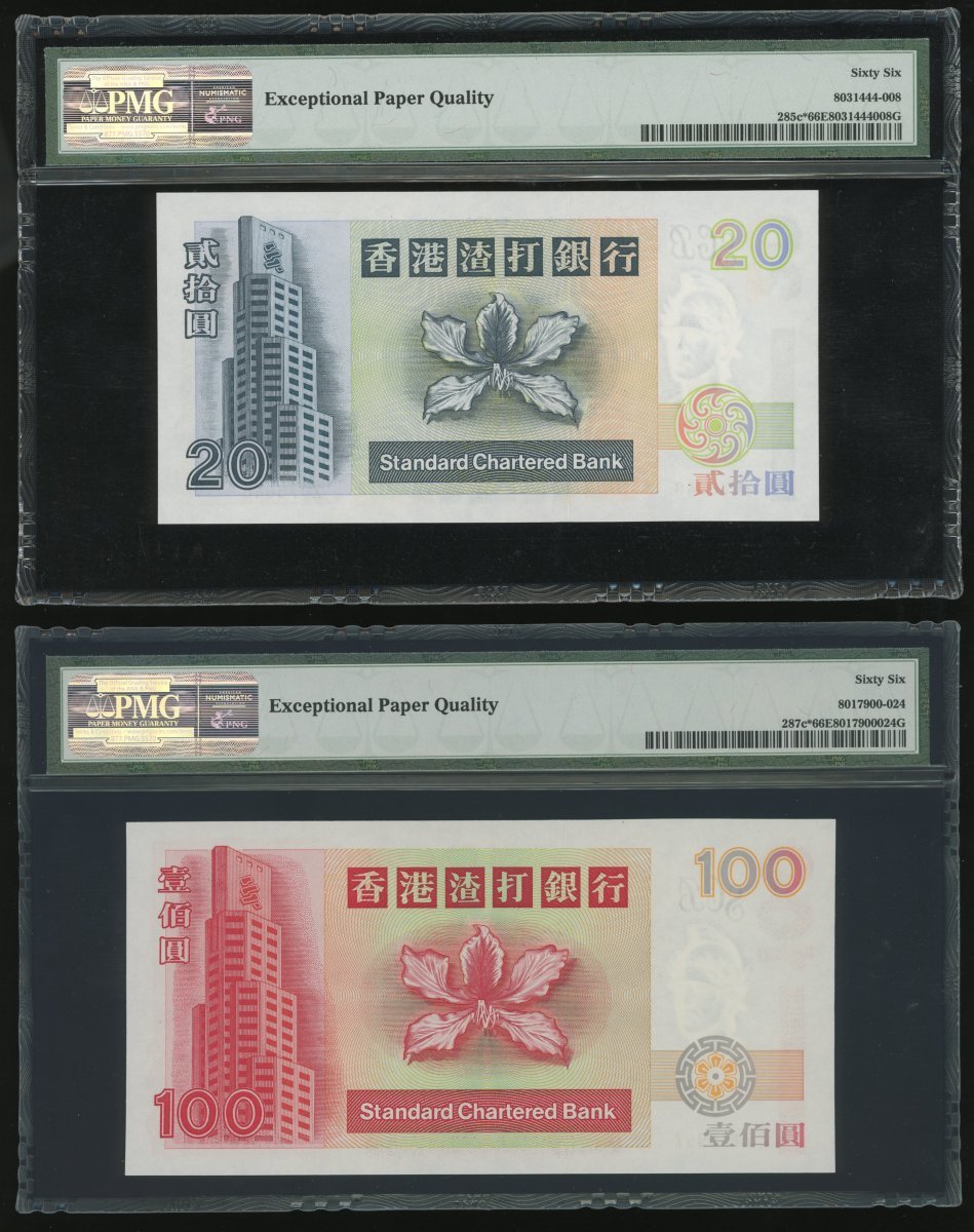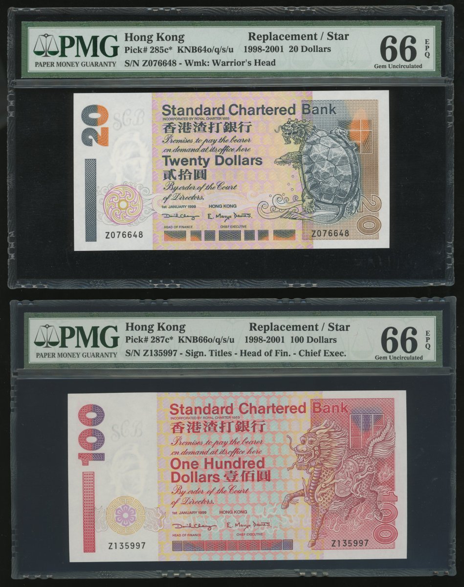 1999年渣打銀20、100及1000元,補版編號Z076648,Z135997及Z059207,分別評PMG 66EPQ,66EPQ及64