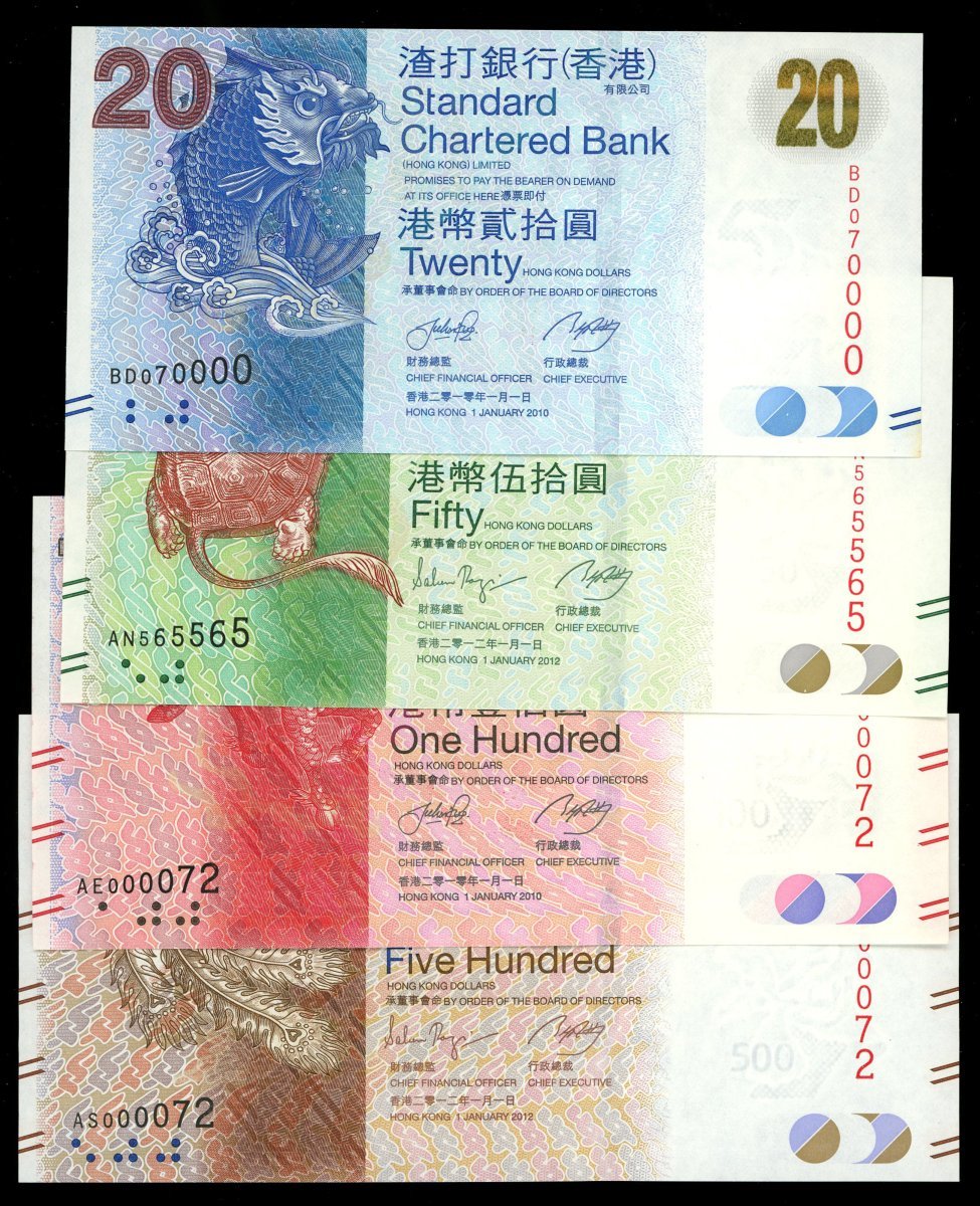 Standard Chartered Bank, set of 5 notes from $20 to $1000, fancy serial numbers: BD070000, AN565565, AE000072, AS000072 and AT010000,