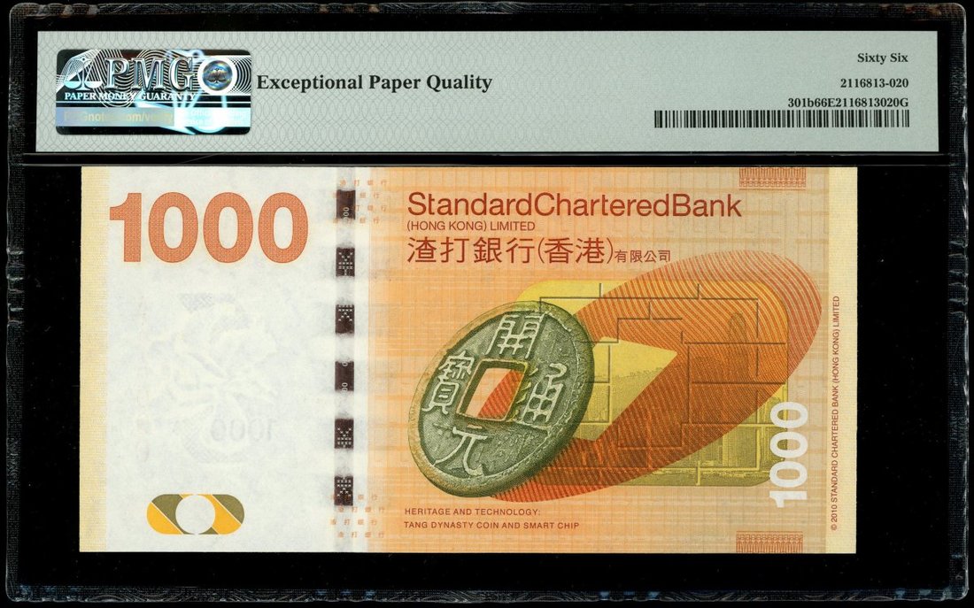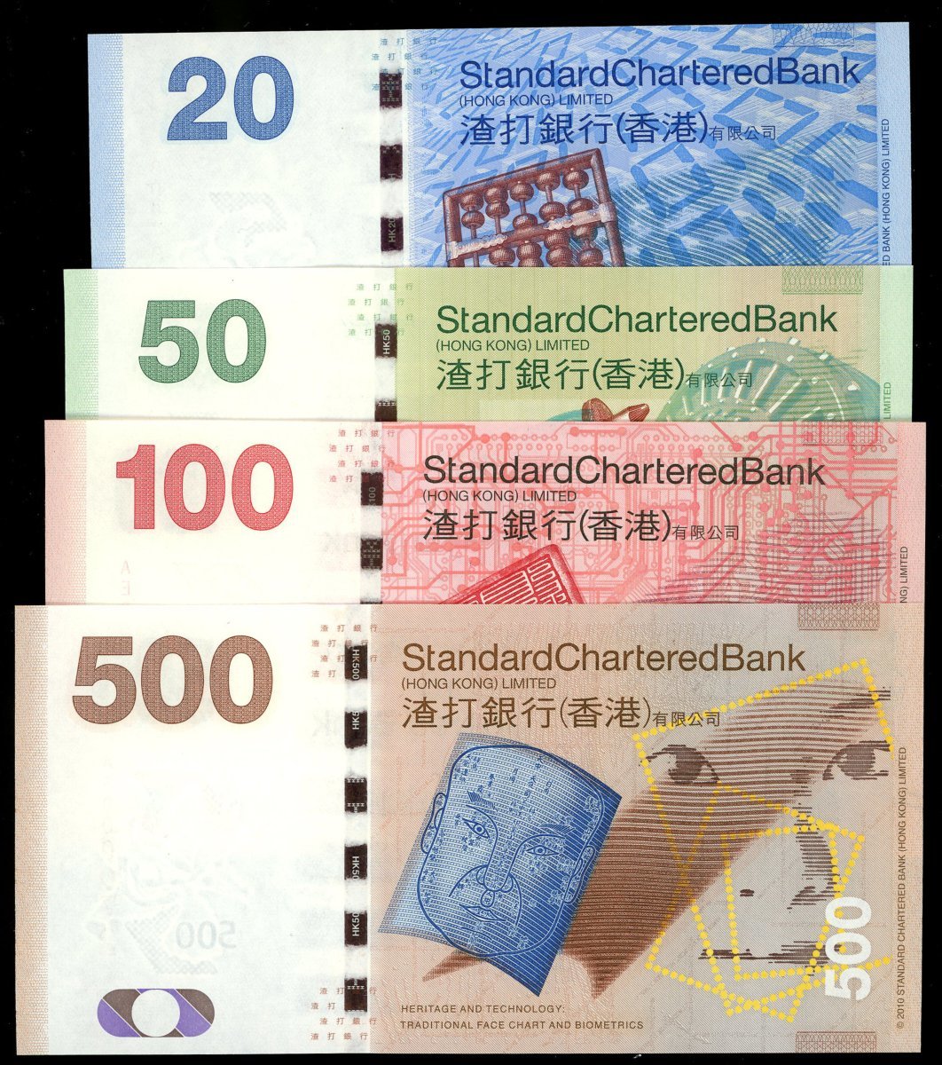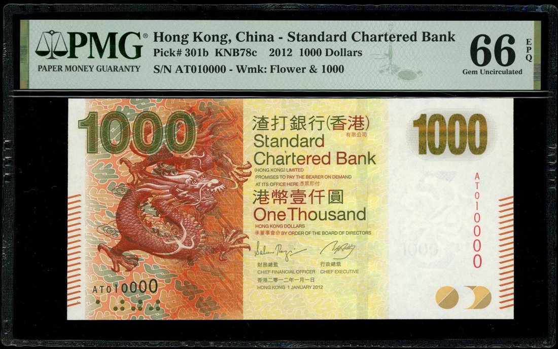 渣打銀行一組5枚,20元至1000元,趣味號BD070000,AN565565,AE000072,AS000072及AT010000,20,50及100元UNC,500元UNC,有軟折,1000元評PMG 66EPQ