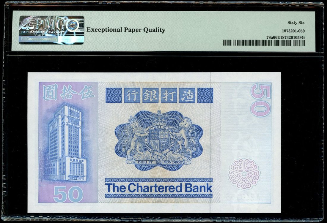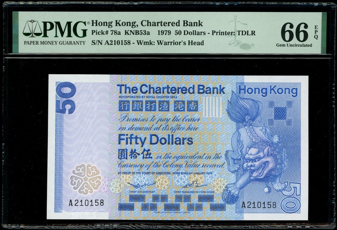 1979年渣打銀行50元,首字軌編號A210158,PMG 66EPQ