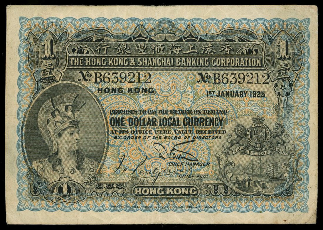 The Hong Kong & Shanghai Banking Corporation, $1, 1.1.1925, serial number B639212, (Pick 171), about fine, with folds.
