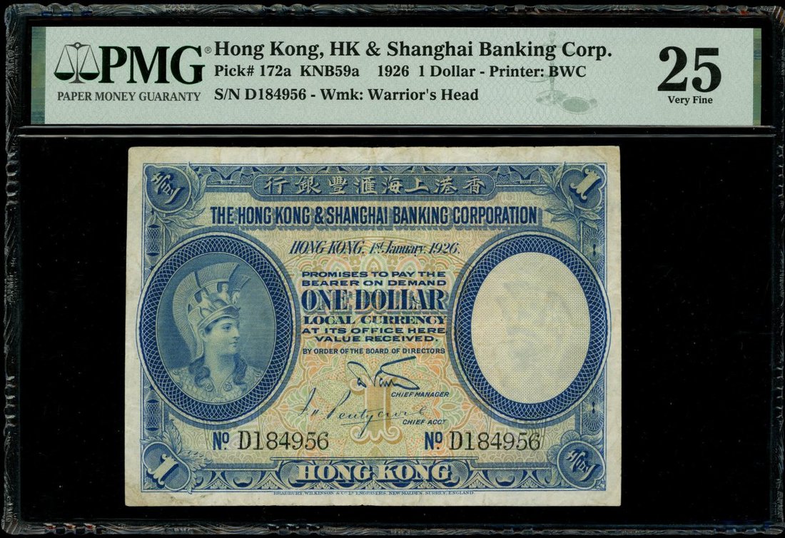 The Hongkong and Shanghai Banking Corporation, $1, 1.1.1926, serial number D184956, (Pick 172a), PMG 25 Very Fine