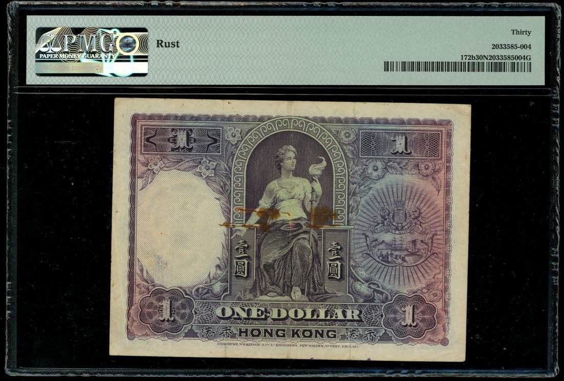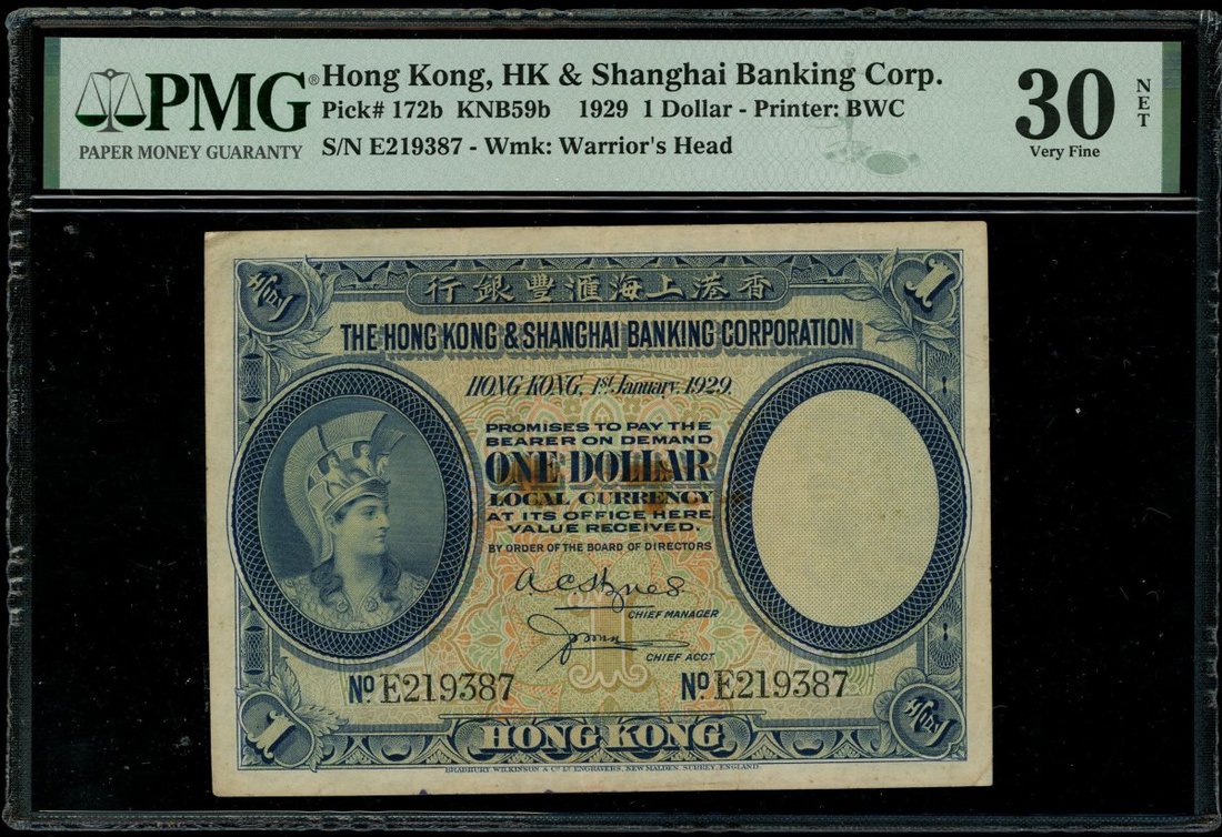 Hong Kong & Shanghai Banking Corporation, $1, 1.1.1929, serial number E219387, (Pick 172b), PMG 30 NET, very fine, rust.