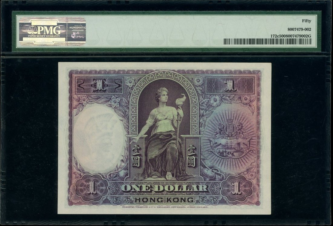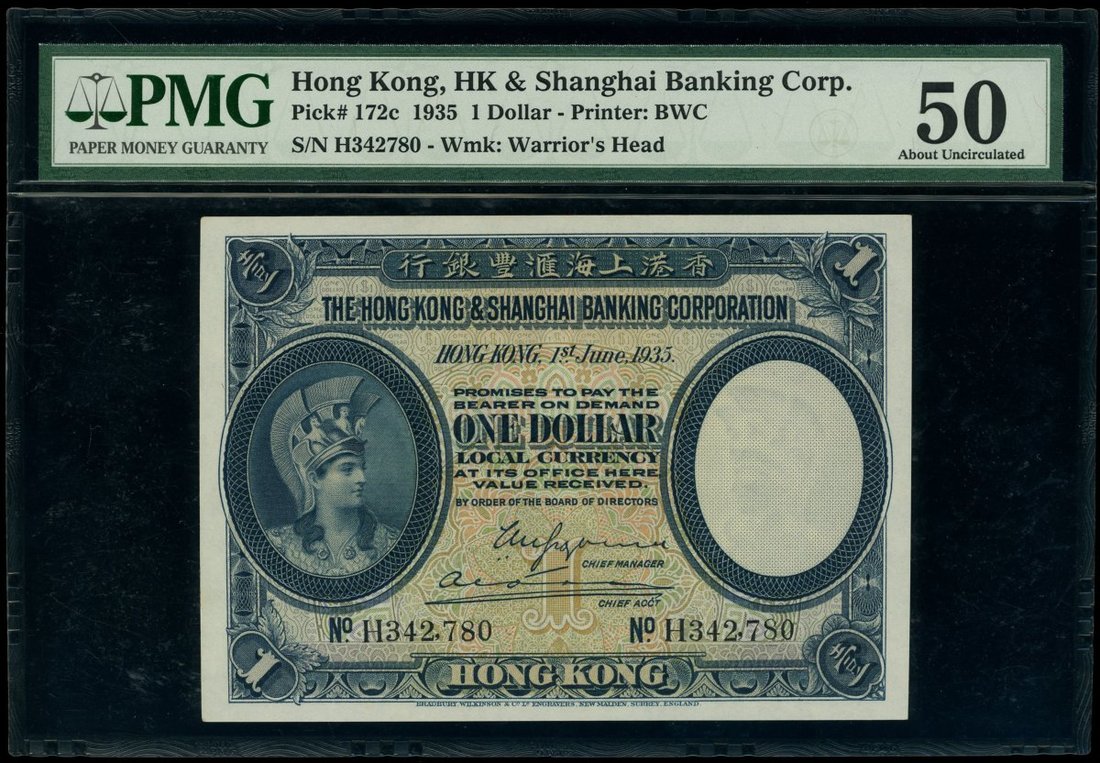 The Hongkong and Shanghai Banking Corporation, $1, 1.6.1935, serial number H342780, (Pick 172c), PMG 50 About Uncirculated.