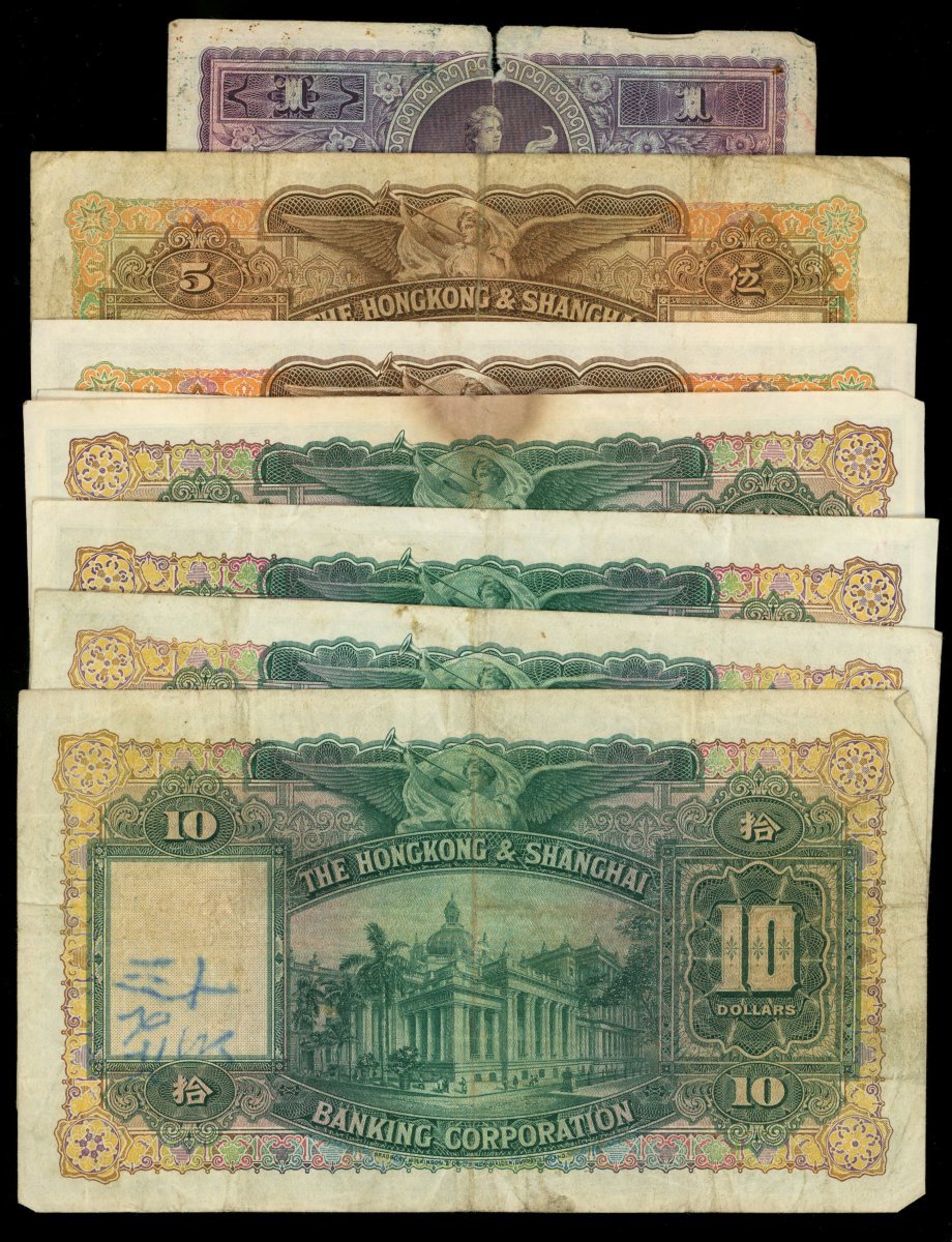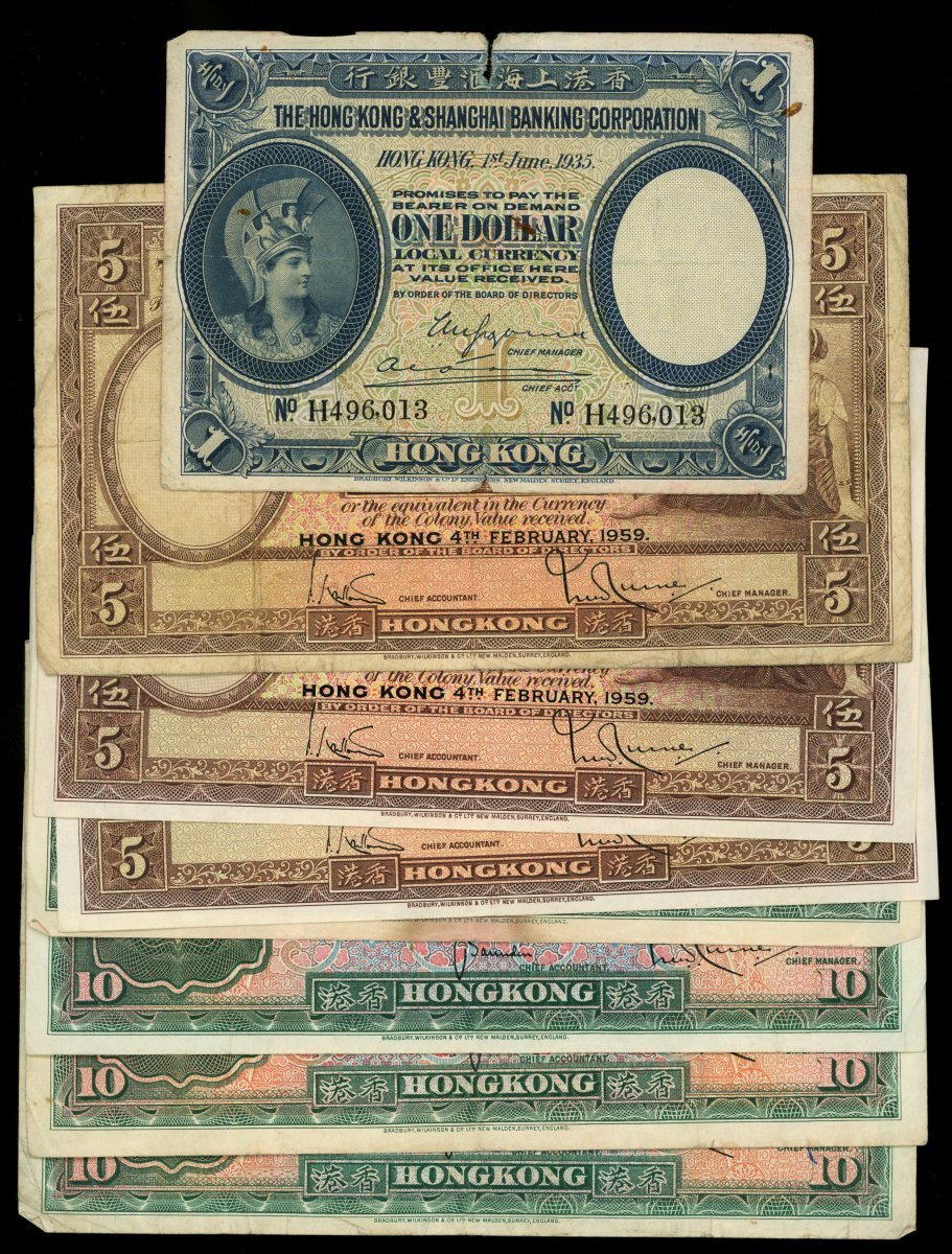 The Hongkong and Shanghai Banking Corporation, a group of 9x notes, consists of 1x $1, 1.6.1935, 3x $5, 7.8.1958(1) and 4.2.1959(2), and 5x $10, 1941, 1948, 1955(2) and 1958, serial numbers H496013, K/H 649379, N/H 768719, N/H 620789, Q333252, H/H 295867, D/J 466253,D/J 720722 and S/J 372354, (various picks), about fine to very fine, viewing recommended, sold as seen, no returns (9).