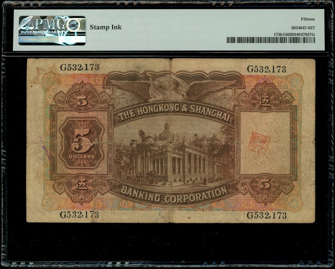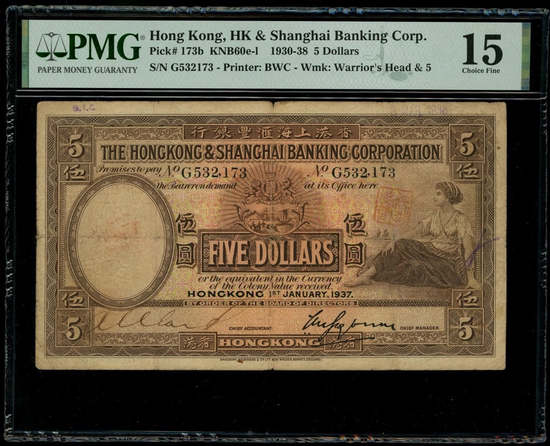 1937年香港上海匯豐銀行5元,編號G532173,左下有手簽,PMG 15(有墨印)