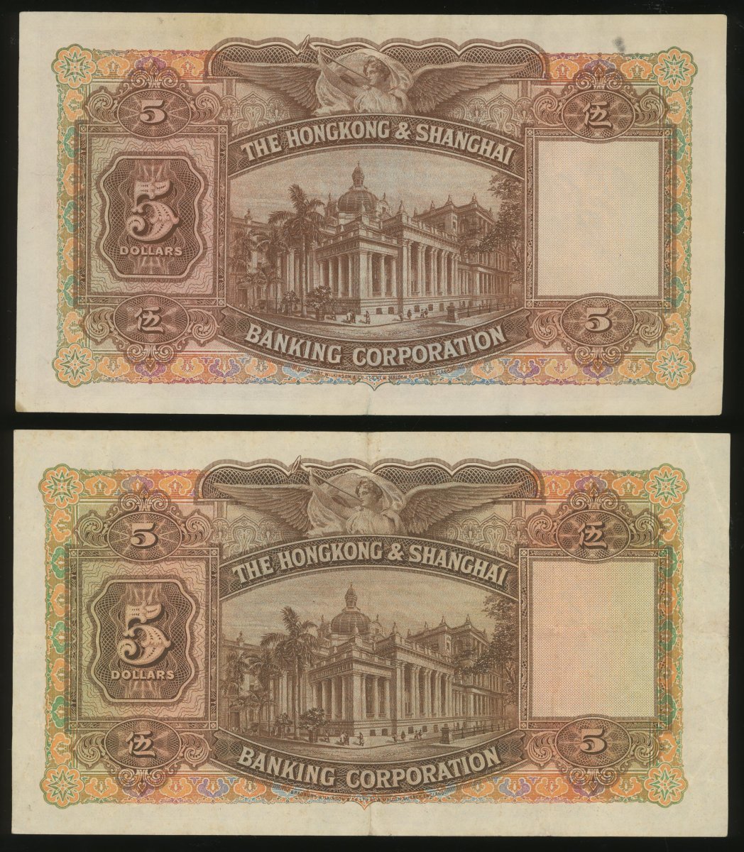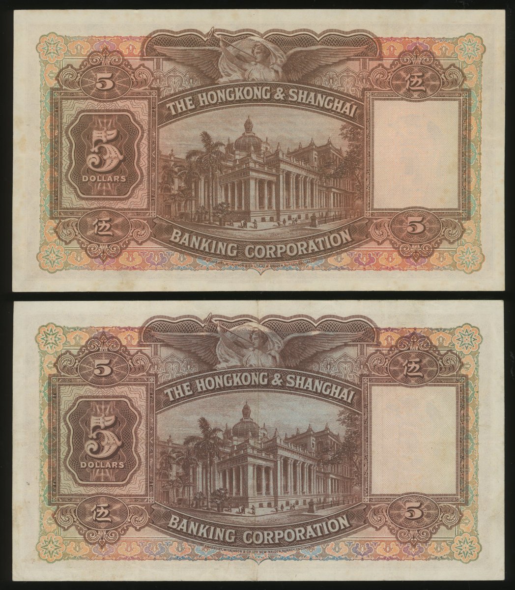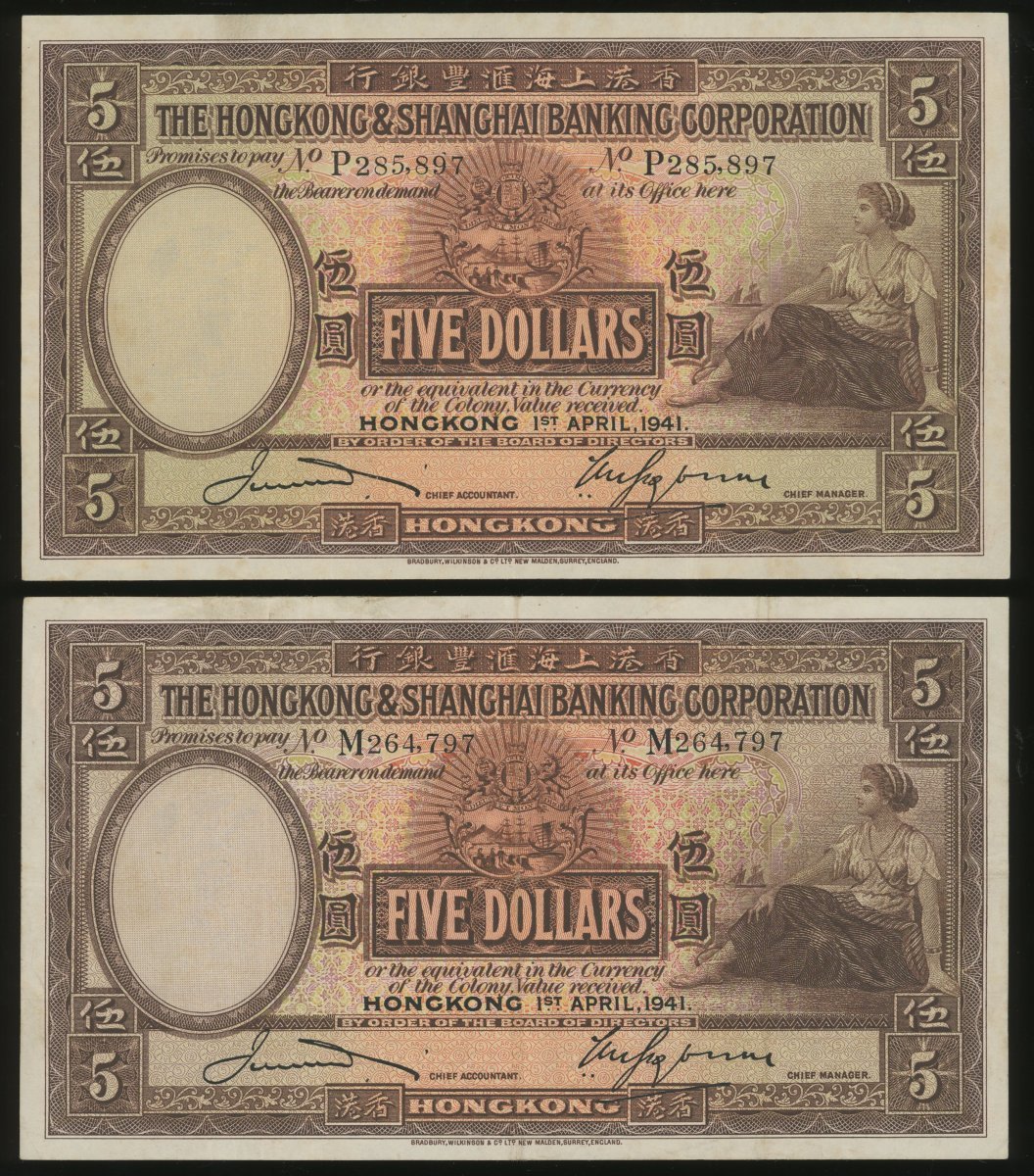 香港上海匯豐銀行5元一組5枚,包括1941年2枚,1946年1枚及1959年2枚,編號M264797,P285897,A/H 354797,M/H 387526及N/H 647940,均GVF品相,有微黃